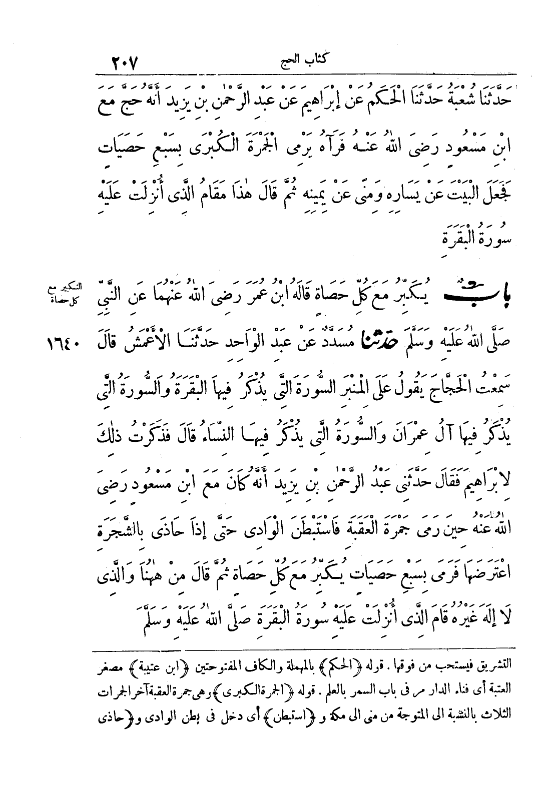 حِينَ رَمَى جَمْرَةَ الْعَقَبَةِ فَاسْتَبْطَنَ الْوَادِيَ حَتَّى إِذَا حَاذَى بِالشَّجَرَةِ اعْتَرَضَهَا فَرَمَى بِسَبْعِ حَصَيَاتٍ يُكَبِّرُ مَعَ كُلِّ حَصَاةٍ ثُمَّ قَالَ مِنْ هَا هُنَا وَالَّذِي لَا إِلَهَ غَيْرُهُ قَامَ الَّذِي أُنْزِلَتْ عَلَيْهِ سُورَةُ الْبَقَرَةِ صَلَّى اللَّهُ عَلَيْهِ وَسَلَّمَ