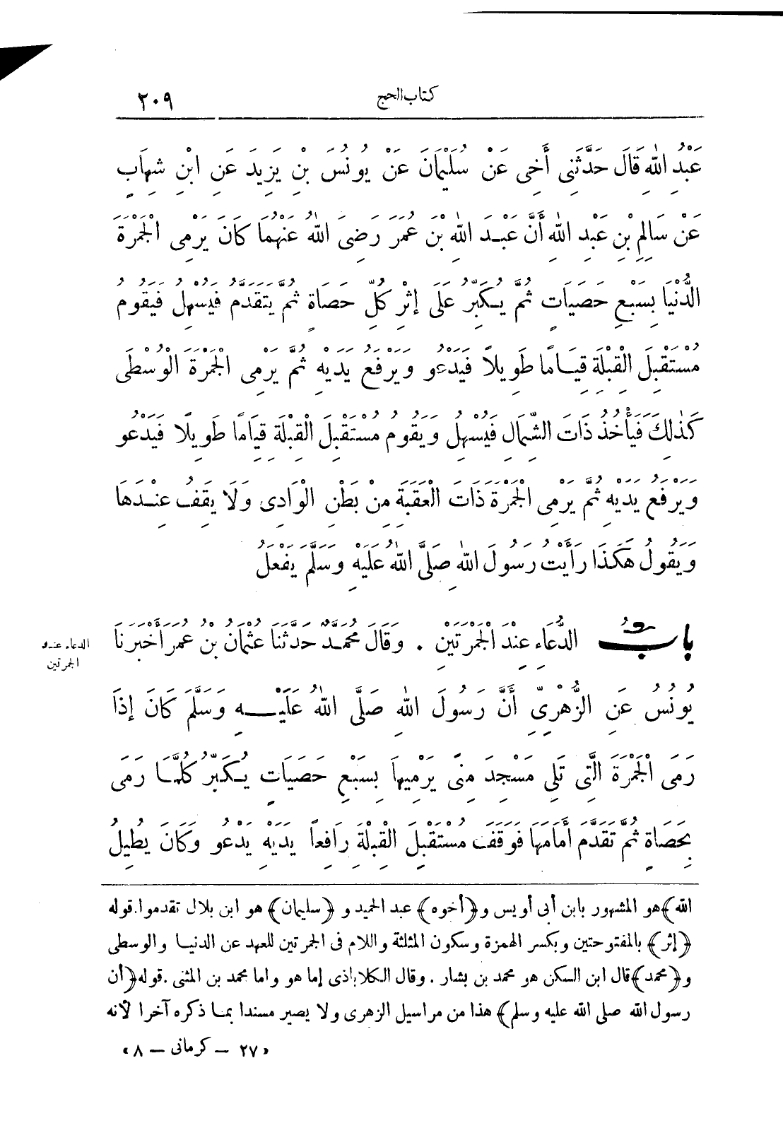 وَقَالَ مُحَمَّدٌ حَدَّثَنَا عُثْمَانُ بْنُ عُمَرَ أَخْبَرَنَا يُونُسُ عَنْ الزُّهْرِيِّ أَنَّ رَسُولَ اللَّهِ صَلَّى اللَّهُ عَلَيْهِ وَسَلَّمَ كَانَ إِذَا رَمَى الْجَمْرَةَ الَّتِي تَلِي مَسْجِدَ مِنًى يَرْمِيهَا بِسَبْعِ حَصَيَاتٍ يُكَبِّرُ كُلَّمَا رَمَى بِحَصَاةٍ ثُمَّ تَقَدَّمَ أَمَامَهَا فَوَقَفَ مُسْتَقْبِلَ الْقِبْلَةِ رَافِعًا يَدَيْهِ يَدْعُو وَكَانَ يُطِيلُ