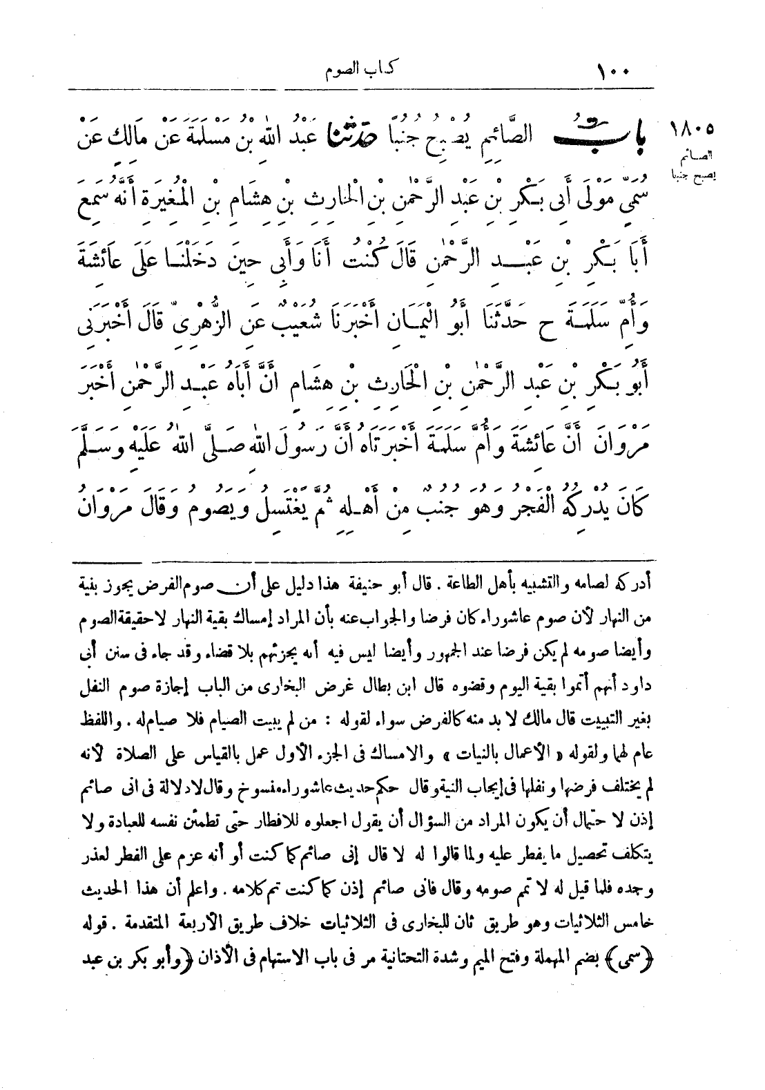 1805 - حَدَّثَنَا عَبْدُ اللَّهِ بْنُ مَسْلَمَةَ عَنْ مَالِكٍ عَنْ سُمَيٍّ مَوْلَى أَبِي بَكْرِ بنِ عَبْدِ الرَّحْمَنِ بنِ الحَارِثِ بْنِ هِشَامِ بْنِ المُغِيرَةِ أَنَّهُ سَمِعَ أَبَا بَكْرِ بْنَ عَبْدِ الرَّحْمَنِ قَالَ كُنْتُ أَنَا وَأَبِي حِينَ دَخَلْنَا عَلَى عَائِشَةَ وَأُمِّ سَلَمَةَ ح وحَدَّثَنَا أَبُو الْيَمَانِ أَخْبَرَنَا شُعَيْبٌ عَنْ الزُّهْرِيِّ قَالَ أَخْبَرَنِي أَبُو بَكْرِ بْنُ عَبْدِ الرَّحْمَنِ بْنِ الْحَارِثِ بْنِ هِشَامٍ أَنَّ أَبَاهُ عَبْدَ الرَّحْمَنِ أَخْبَرَ مَرْوَانَ أَنَّ عَائِشَةَ وَأُمَّ سَلَمَةَ أَخْبَرَتَاهُ أَنَّ رَسُولَ اللَّهِ صَلَّى اللَّهُ عَلَيْهِ وَسَلَّمَ كَانَ يُدْرِكُهُ الْفَجْرُ وَهُوَ جُنُبٌ مِنْ أَهْلِهِ ثُمَّ يَغْتَسِلُ وَيَصُومُ
