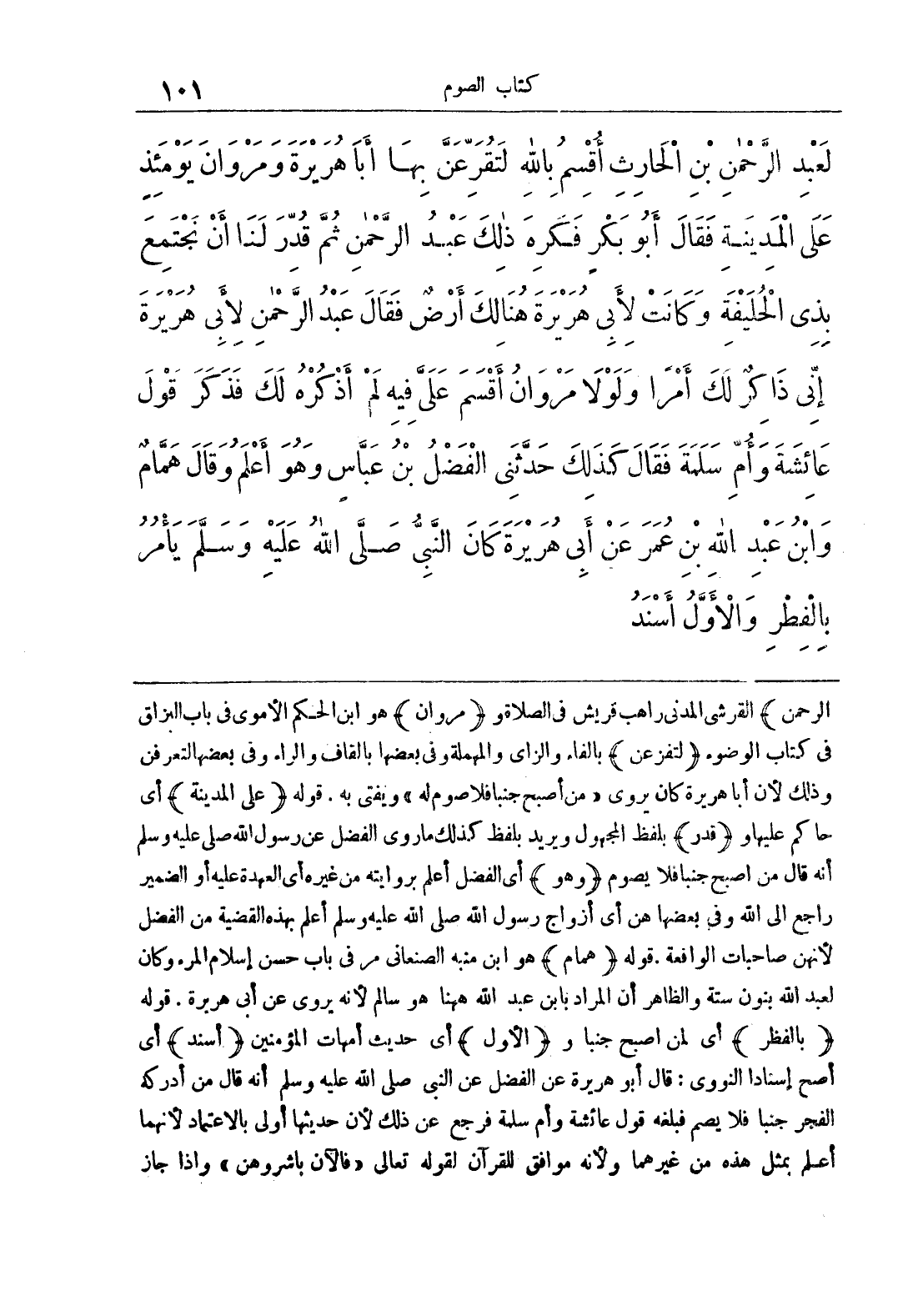الرحمن} القرشي المدني راهب قريش في الصلاة و {مروان} هو ابن الحكم الأموي في باب البزاق في كتاب الوضوء {لتفزعن} بالفاء والزاي والمهملة وفي بعضها بالقاف والراء وفي بعضها لتعرفن وذلك لأن أبا هريرة كان يروي «من أصبح جنبا فلا صوم له» ويفتي به, قوله {على المدينة} أي حاكم عليها و {قدر} بلفظ المجهول ويريد بلفظ كذلك ما روى الفضل عن رسول الله صلى عليه وسلم أنه قال من أصبح جنبا فلا صوم {وهو} أي الفضل أعلم بروايته من غيره أي العهدة عليه أو الضمير راجع إلى الله وفي بعضها هن أي أزواج رسول الله صلى الله عليه وسلم أعلم بهذه القضية من الفضل لأنهن صاحبات الواقعة , قوله {همام} هو ابن منبه الصنعاني مر في باب حسن إسلام المرء وكان لعبد الله بنون ستة والظاهر أن المراد بابن عبد الله ههنا هو سالم لأنه يروي عن أبي هريرة, قوله {بالفطر} أي لمن أصبح جنبا و {الأول} أي حديث أمهات المؤمنين {أسند} أي أصح إسنادا النووي: قال أبو هريرة عن الفضل عن النبي صلى الله عليه وسلم أنه قال من أدركه الفجر جنبا فلا يصم فبلغه قول عائشة وأم سلمة فرجع عن ذلك لأن حديثها أولى بالاعتماد لأنهما أعلم بمثل هذه من غيرهما ولأنه موافق للقرآن لقوله تعالى «فالآن باشروهن» وإذا جاز
