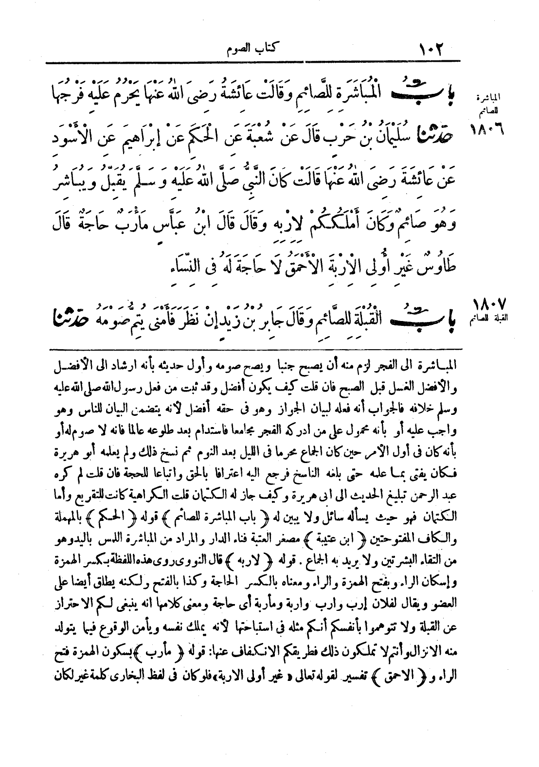 المباشرة إلى الفجر لزم منه أن يصبح جنبا ويصح صومه وأول حديثه بأنه إرشاد إلى الأفضل والأفضل الغسل قبل الصبح فإن قلت كيف يكون أفضل وقد ثبت من فعل رسول الله صلى الله عليه وسلم خلافه فالجواب أنه فعله لبيان الجواز وهو في حقه أفضل لأنه يتضمن البيان للناس وهو واجب عليه أو بأنه محمول على من أدركه الفجر مجامعا فاستدام بعد طلوعه عالما فإنه لا يصوم له أو بأنه كان في أول الأمر حين كان الجماع محرما في الليل بعد النوم ثم نسخ ذلك ولم يعلمه أبو هريرة فكان يفتي بما علمه حتى بلغه الناسخ فرجع إليه اعترافا بالحق وإتباعا للحجة فإن قلت لم كره عبد الرحمن تبليغ الحديث إلى أبي هريرة جاز له الكتمان قلت الكراهية كانت للتقريع وأما الكتمان فهو حيث يسأله سائل ولا يبين له {باب المباشرة للصائم} قوله {الحكم} بالمهملة والكاف المفتوحتين {ابن عتيبة} مصغر العتبة فناء الدار والمراد من المباشرة اللمس باليد وهو من التقاء البشرتين ولا يريد به جماع, قوله {لا ربه} قال النووي روى هذه اللفظة بكسر الهمزة وإسكان الراء وبفتح الهمزة ومعناه بالكسر الحاجة ولكنه يطلق أيضا على العضو ويقال لفلان إرب وارب واربة ومأربة أي حاجة ومعنى كلامها أنه ينبغي لكم الاحتراز عن القبلة ولا تتوهموا بأنفسكم أنكم مثله في استحبابها لأنه يملك نفسه ويأمن الوقوع فيما يتولد منه الإنزال وأنتم لا تملكون ذلك فطريقكم الإنكفاف عنها: قوله {مأرب} بسكون الهمزة فتح الراء و {الأحمق} تفسير لقوله تعالى «غير أولى الإربة» فلو كان في لفظ البخاري كلمة غير لكان