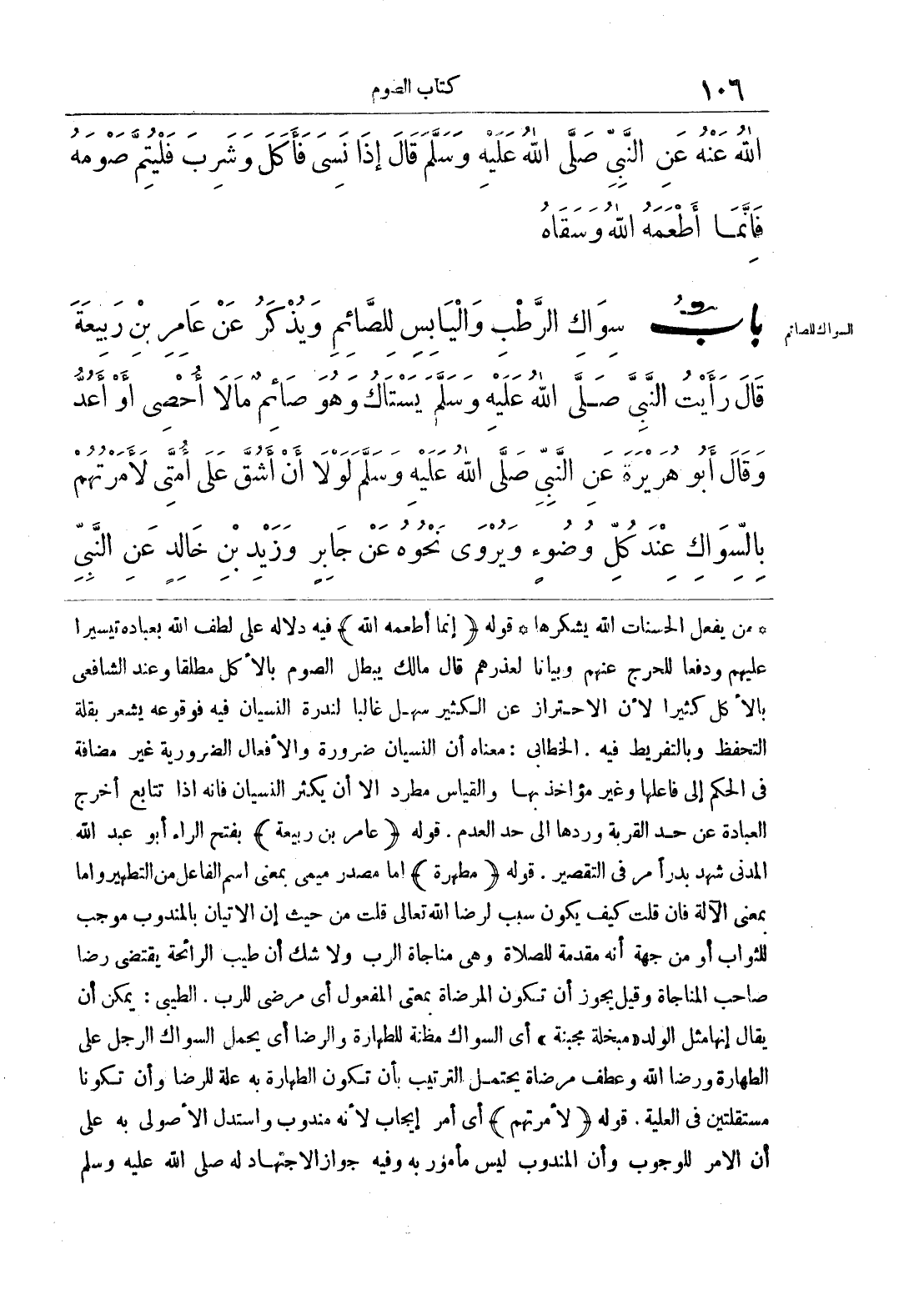 * من يفعل الحسنات الله يشكرها * قوله {إنما أطعمه الله} فيه دليل على لطف الله بعباده تيسيرا عليهم ودفعا للحرج عنهم وبيانا لعذرهم قال مالك يبطل الصوم بالأكل مطلقا وعند الشافعي بالأكل كثيرا لأن الاحتراز عن الكثير سهل غالبا لندرة النسيان فيه فوقوعه يشعر بقلة التحفظ وبالتفريط فيه, الخطابي: معناه أن النسيان ضرورة والأفعال الضرورية غير مضافة في الحكم إلى فاعلها وغير مؤاخذ بها والقياس مطرد إلا أن يكثر النسيان فإنه إذا تتابع أخرج العبادة عن حد القربة وردها إلى حد العدم , قوله {عامر بن ربيعة} بفتح الراء أبو عبد الله المدني شهد بدر أمر في التقصير, قوله {مطهرة} إما مصدر ميمي بمعنى اسم الفاعل من التطهير وإما بمعنى الآلة فإن قلت كيف يكون سبب لرضا الله تعالى قلت من حيث إن الإتيان بالمندوب موجب للثواب أو من أنه مقدمة للصلاة وهي مناجاة الرب ولا شك أن طيب الرائحة يقتضي رضا صاحب المناجاة وقيل يجوز أن تكون المرضاة بمعنى المفعول أي مرضى للرب, الطيبي: يمكن أن يقال إنها مثل الولد «مبخلة مجبنة» أي السواك مظنة للطهارة والرضا أي يحمل السواك الرجل على الطهارة ورضا الله وعطف مرضاة يحتمل الترتيب بأن تكون الطهارة به علة للرضا وأن تكونا مستقلتين في العلية, قوله {لأمرتهم} أي أمر إيجاب لأنه مندوب واستدل الأصولي به على أن الأمر للوجوب وأن المندوب ليس مأمور به وفيه جواز الاجتهاد له صلى الله عليه وسلم