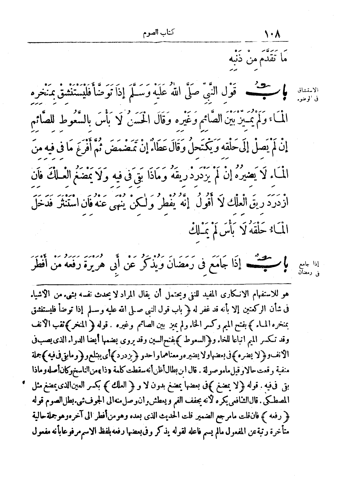 هو للاستفهام الإنكاري المفيد للنفي ويحتمل أن يقال المراد لا يحدث نفسه بشيء من الأشياء في شأن الركعتين إلا بأنه قد غفر له {باب قول النبي صلى الله عليه وسلم إذا توضأ فليستنشق بمنخره الماء} بفتح الميم وكسر الخاء ولم يميز بين الصائم وغيره, قوله {المنخر} ثقب الأنف وقد تكسر الميم إتباعا للخاء و {السعوط} بفتح السين وقد يروي بضمها أيضا الدواء الذي يصب في الأنف و {لا يضره} في بعضها ولا يضيره ومعناهما واحد و {يزدرد} أي يبتلع و {وما بقى في فيه} جملة منفية وقعت حالا وقيل ما موصولة, قال ابن بطال أظن أنه سقطت كلمة «ذا» من الناسخ وكان أصله وماذا بقى في فيه, قوله {لا يمضغ} في بعضها يمضغ بدون لا و {العلك} بكسر العين الذي يمضغ مثل المصطكي, قال الشافعي يكره لأنه يجفف الفم ويعطش وان وصل منه إلى الجوف شيء بطل الصوم قوله {رفعة} فإن قلت ما مرجع الضمير قلت الحديث الذي بعده وهو من أفطر إلى آخره وهو جملة حالية متأخرة رتبة عن المفعول مالم يسم فاعله لقوله يذكر وفي بعضها رفعه بلفظ الاسم مرفوعا بأنه مفعول