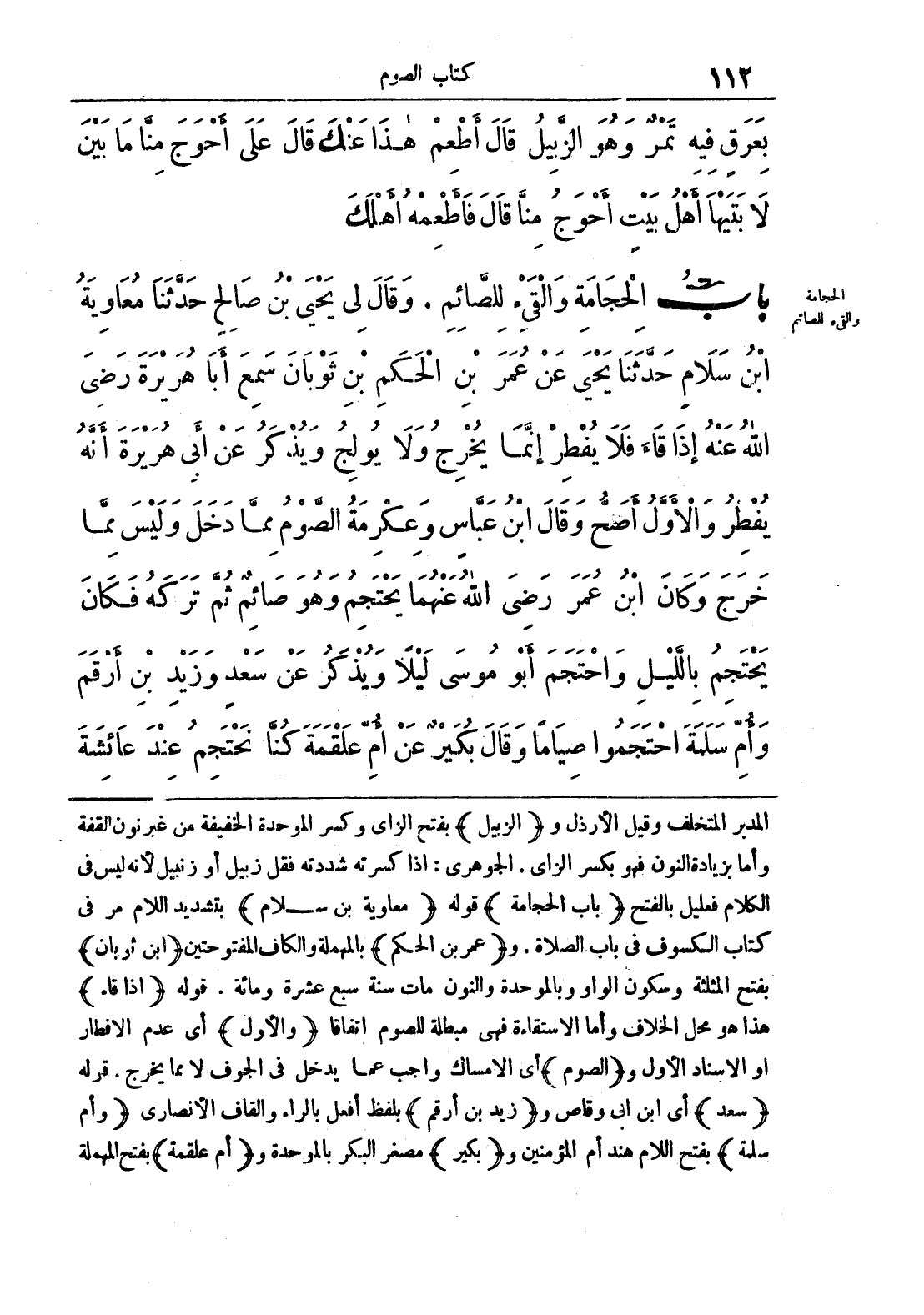 المدبر المتخلف وقيل الأرذل و {الزبيل} بفتح الزاي وكسر الموحدة الخفيفة من غير نون القفة وأما بزيادة النون فهو بكسر الزاي, الجوهري: إذا كسرته شددته فقل زبيل أو زنبيل لأنه ليس في الكلام فعليل بالفتح {باب الحجامة} قوله {معاوية بن سلام} بتشديد اللام مر في كتاب الكسوف في باب الصلاة, و {عمر بن الحكم} بالمهملة والكاف المفتوحتين {ابن ثوبان} بفتح المثلثة وسكون الواو وبالموحدة والنون مات سنة سبع عشرة ومائة, قوله {إذا قاء} هذا هو محل الخلاف وأما الإستقاءة فهي مبطلة للصوم اتفاقا {والأول} أي عدم الإفطار أو الإسناد الأول و {الصوم} أي الإمساك واجب عما يدخل في الجوف لا مما يخرج, {سعد} أي ابن أبي وقاص و {زيد بن الأرقم} بلفظ أفعل بالراء والقاف الأنصاري {وأم سلمة} بفتح اللام هند أم المؤمنين و {بكير} مصغر البكر بالموحدة و {أم علقمة} بفتح المهملة