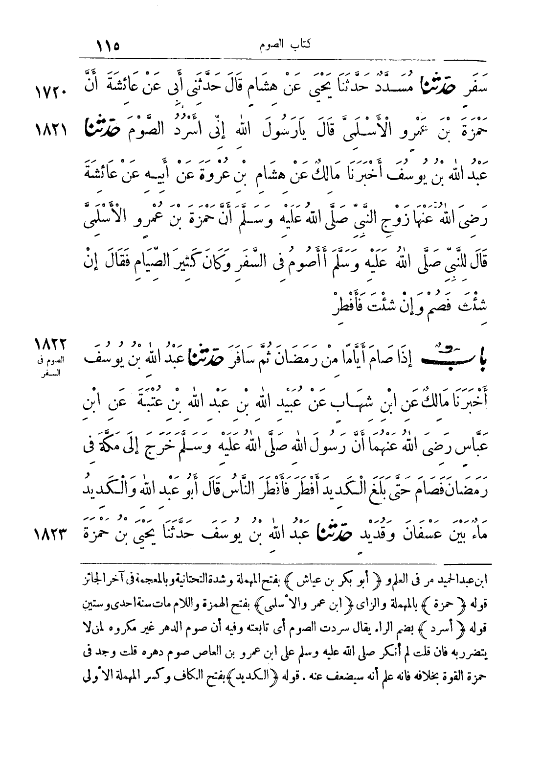 1822 - حَدَّثَنَا عَبْدُ اللَّهِ بْنُ يُوسُفَ أَخْبَرَنَا مَالِكٌ عَنْ ابْنِ شِهَابٍ عَنْ عُبَيْدِ اللَّهِ بْنِ عَبْدِ اللَّهِ بْنِ عُتْبَةَ عَنْ ابْنِ عَبَّاسٍ رَضِيَ اللَّهُ عَنْهُمَا أَنَّ رَسُولَ اللَّهِ صَلَّى اللَّهُ عَلَيْهِ وَسَلَّمَ خَرَجَ إِلَى مَكَّةَ فِي رَمَضَانَ فَصَامَ حَتَّى بَلَغَ الْكَدِيدَ أَفْطَرَ فَأَفْطَرَ النَّاسُ