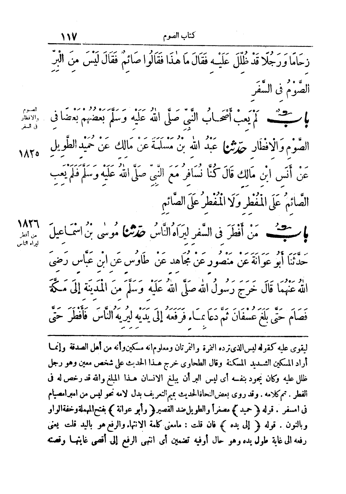 1826 - حَدَّثَنَا مُوسَى بْنُ إِسْمَاعِيلَ حَدَّثَنَا أَبُو عَوَانَةَ عَنْ مَنْصُورٍ عَنْ مُجَاهِدٍ عَنْ طَاوُسٍ عَنْ ابْنِ عَبَّاسٍ رَضِيَ اللَّهُ عَنْهُمَا قَالَ خَرَجَ رَسُولُ اللَّهِ صَلَّى اللَّهُ عَلَيْهِ وَسَلَّمَ مِنْ الْمَدِينَةِ إِلَى مَكَّةَ فَصَامَ حَتَّى بَلَغَ عُسْفَانَ ثُمَّ دَعَا بِمَاءٍ فَرَفَعَهُ إِلَى يَدَيْهِ لِيُرِيَهُ النَّاسَ فَأَفْطَرَ حَتَّى