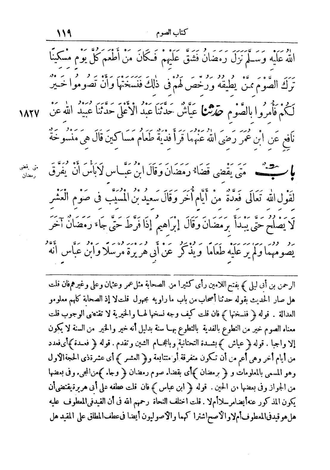 الرحمن بن أبي ليلي} بفتح اللامين رأى كثيرا من الصحابة مثل عمر وعثمان وعلي وغيرهم فإن قلت هل صار الحديث بقوله حدثنا أصحاب من باب ما راويه مجهول قلت لا إذ الصحابة كلهم معلومو العدالة , قوله {فنسختها} فإن قلت كيف وجه نسخها لها والخيرية لا تقتضي الوجوب قلت معناه الصوم خير من التطوع بالفدية بالتطوع بها سنة بدليل أنه خير والخير من السنة لا يكون إلا واجبا, قوله {عياش} بشدة التحتانية وباعجام الشين وتقدم , قوله {فعدة} أي فعدد من أيام أخر وهي أعم من أن تكون متفرقة أو متتابعة و {العشر} أي عشرة ذي الحجة الأولى وهو المسمى بالمعلومات و {برمضان} أي بقضاء صوم رمضان {وجاء} من المجيء وفي بعضها من الجواز وفي بعضها من الحين, قوله {ابن عباس} فإن قلت عطفه علي أبي هريرة يقتضي أن يكون المذكور عنه أيضا مرسلا أم لا, قلت اختلف النحاة رحمهم الله في أن القيد في المعطوف عليه هل هو قيد في المعطوف أم لا والأصح اشتراكهما والأصوليون أيضا في عطف المطلق على المقيد هل