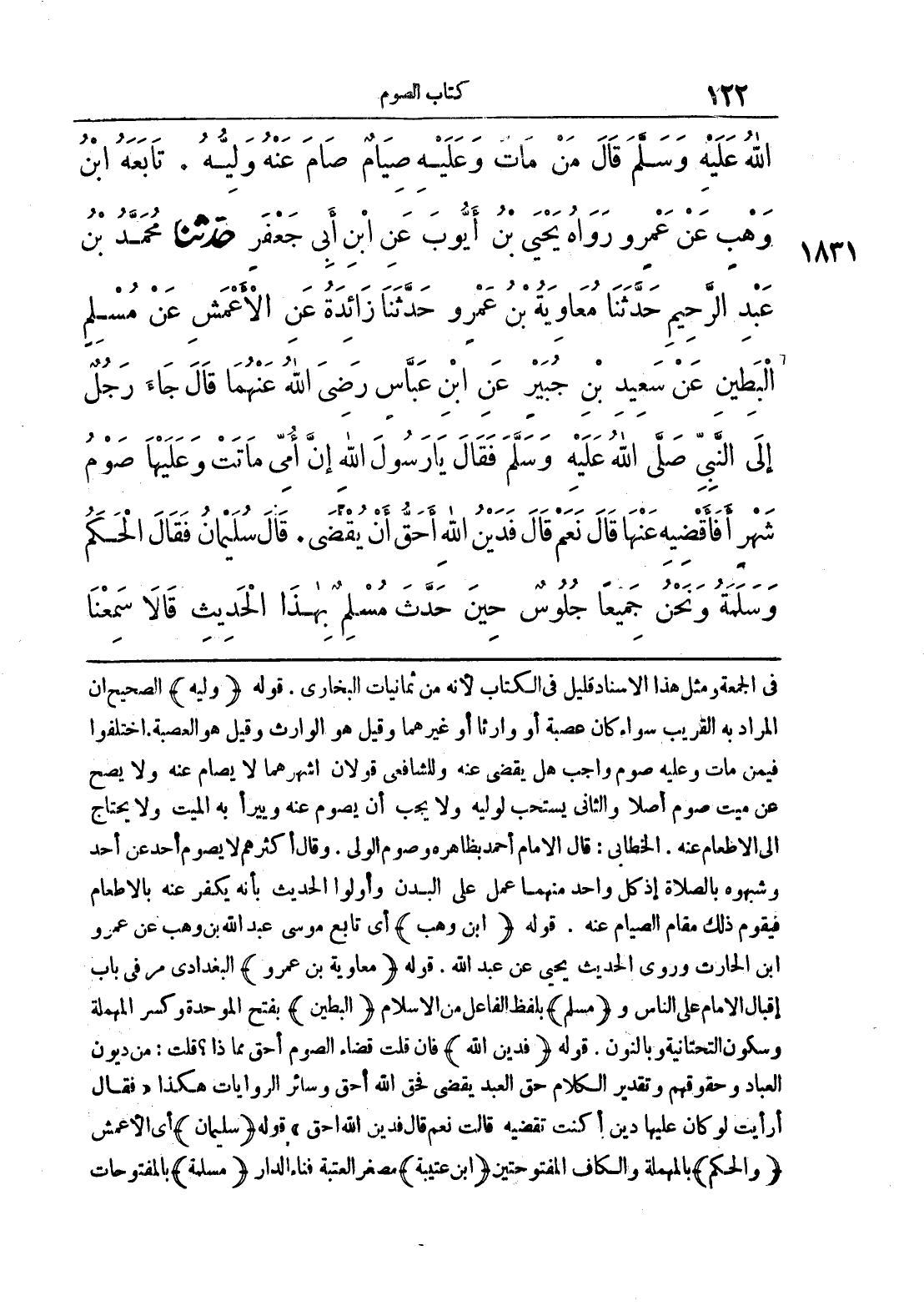 في الجمعة ومثل هذا الإسناد قليل في الكتاب لأنه من ثمانيات البخاري, قوله {وليه} الصحيح أن المراد به القريب سواء كان عصبة أو وارثا أو غيرهما وقيل هو الوارث وقيل هو العصبة, اختلفوا فيمن مات وعليه صوم واجب هل يقضي عنه وللشافعي قولان أشهرهما لا يصام عنه ولا يصح عن الميت صوم أصلا والثاني يستحب لوليه ولا يجب أن يصوم عنه وييرأ به الميت ولا يحتاج إلى الإطعام عنه, الخطابي: قال الإمام أحمد بظاهره وصوم الولي, وقال أكثرهم لا يصوم أحد عن أحد وشبهوه بالصلاة إذ كل واحد منهما عمل على البدن وأولوا الحديث بأنه يكفر عنه بالإطعام فيقوم ذلك مقام الصيام عنه, قوله {ابن وهب} أي تابع موسى عبد الله بن وهب عن عمرو ابن حارث وروى الحديث يحي عن عبد الله, قوله {معاوية بن عمرو} البغدادي مر في باب إقبال الإمام على الناس و {مسلم} بلفظ الفاعل من الإسلام {البطين} بفتح الموحدة وكسر المهملة وسكون التحتانية وبالنون ,قوله {فدين الله} فإن قلت قضاء الصوم أحق مما ذا؟ قلت: من ديون العبادة وحقوقهم وتقدير الكلام حق العبد يقضي فحق الله أحق وسائر الروايات هكذا «فقال أرأيت لو كان عليها دين أكنت تقضيه قالت نعم قال فدين الله أحق» قوله {سليمان} أي الأعمش {والحكم} بالمهملة والكاف المفتوحتين {ابن عتيبة} مصغر العتبة فناء الدار {مسلمة} بالمفتوحات
