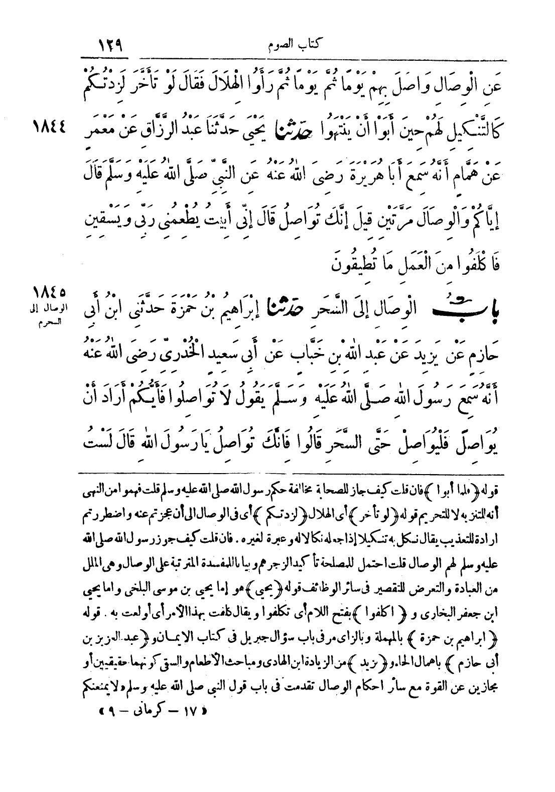 1845 - حَدَّثَنَا إِبْرَاهِيمُ بْنُ حَمْزَةَ حَدَّثَنِي ابْنُ أَبِي حَازِمٍ عَنْ يَزِيدَ عَنْ عَبْدِ اللَّهِ بْنِ خَبَّابٍ عَنْ أَبِي سَعِيدٍ الْخُدْرِيِّ رَضِيَ اللَّهُ عَنْهُ أَنَّهُ سَمِعَ رَسُولَ اللَّهِ صَلَّى اللَّهُ عَلَيْهِ وَسَلَّمَ يَقُولُ لَا تُوَاصِلُوا فَأَيُّكُمْ أَرَادَ أَنْ يُوَاصِلَ فَلْيُوَاصِلْ حَتَّى السَّحَرِ قَالُوا فَإِنَّكَ تُوَاصِلُ يَا رَسُولَ اللَّهِ قَالَ لَسْتُ