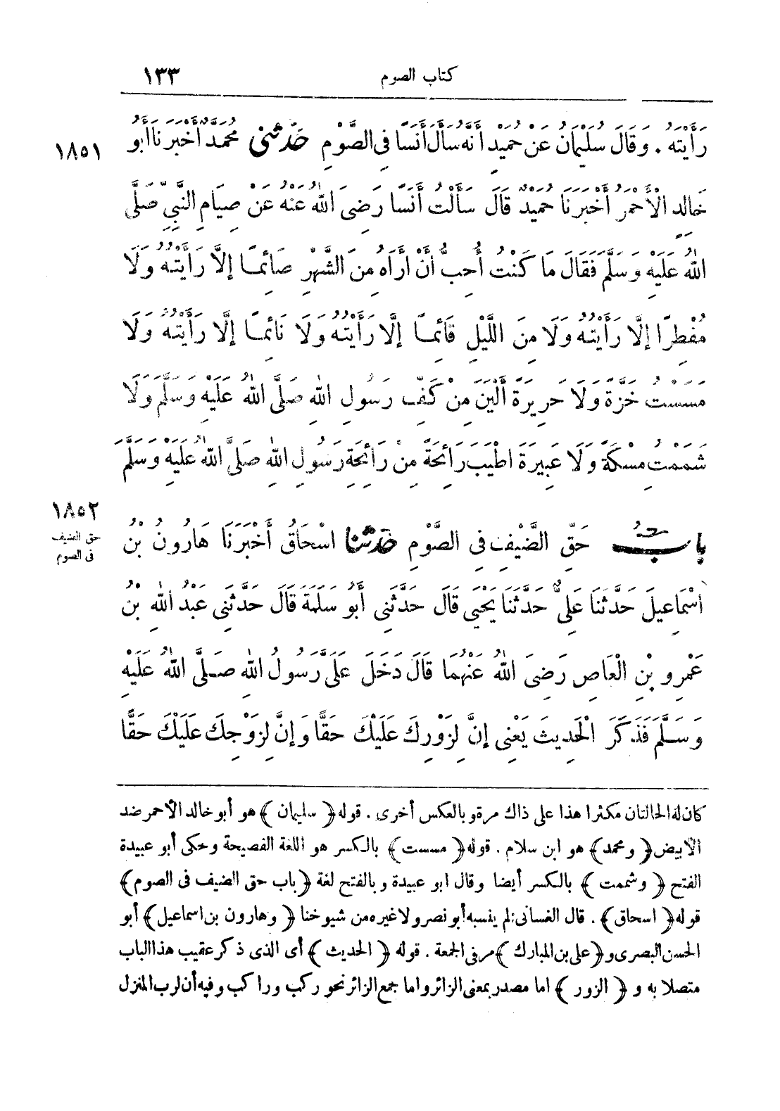 كان له الحالتان مكثرا هذا على ذاك مرة وبالعكس أخرى ,قوله {سليمان} هو أبو خالد الأحمر ضد الأبيض {ومحمد} هو ابن سلام, قوله {مسست} بالكسر هو اللغة الفصيحة وحكي أبو عبيدة الفتح {وشممت} بالكسر أيضا وقال أبو عبيد وبالفتح لغة {باب حق الضيف في الصوم} قوله {إسحاق} , قال الغساني: لم ينسبه أبو نصر ولا غيره من شيوخنا {وهارون بن إسماعيل} أبو الحسن البصري و {علي بن المبارك} مر في الجمعة, قوله {الحديث} أي الذي ذكر عقيب هذا الباب متصلا به و {الزور} إما مصدر بمعنى الزائر وإما جمع الزائر ركب وراكب وفيه أن لرب المنزل