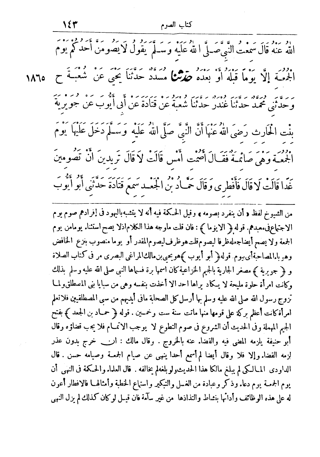 1865 - حَدَّثَنَا مُسَدَّدٌ حَدَّثَنَا يَحْيَى عَنْ شُعْبَةَ ح وحَدَّثَنِي مُحَمَّدٌ حَدَّثَنَا غُنْدَرٌ حَدَّثَنَا شُعْبَةُ عَنْ قَتَادَةَ عَنْ أَبِي أَيُّوبَ عَنْ جُوَيْرِيَةَ بِنْتِ الْحَارِثِ رَضِيَ اللَّهُ عَنْهَا أَنَّ النَّبِيَّ صَلَّى اللَّهُ عَلَيْهِ وَسَلَّمَ دَخَلَ عَلَيْهَا يَوْمَ الْجُمُعَةِ وَهِيَ صَائِمَةٌ فَقَالَ أَصُمْتِ أَمْسِ قَالَتْ لَا قَالَ تُرِيدِينَ أَنْ تَصُومِي غَدًا قَالَتْ لَا قَالَ فَأَفْطِرِي