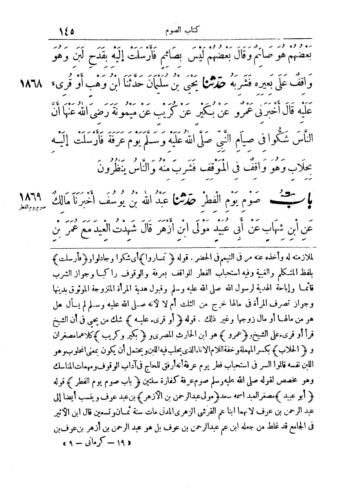 لملازمته له وأخذه عنه مر في التيمم في الحضر, قوله {تماروا} أي شكوا وجادلوا و {فأرسلت} بلفظ المتكلم والغيبة وفيه استحباب الفطر للواقف بعرفة والوقوف راكبا وجواز الشرب قائما وإباحة الهدية لرسول الله صلى الله عليه وسلم وقبول هدية المرأة المتزوجة الموثوق بدينها وجواز تصرف المرأة في مالها خرج من الثلث أم لا لأنه صلى الله عليه وسلم لم يسأل هل هو من مالها أو مال زوجها وغير ذلك, قوله {أو قرئ عليه} شك من يحي في أن الشيخ قرأ أو قرئ على الشيخ و {عمرو} هو ابن الحارث المصري و {بكير وكريب} كلاهما مصغران و {الحلاب} بكسر المهملة وخفة اللام الإناء الذي يحلب فيه اللبن ويحتمل أن يكون بمعنى المحلوب وهو اللبن نفسه قالوا السر في استحباب فطر يوم عرفة أنه أرفق للحاج في آداب الوقوف ومهمات المناسك وهو مخصص لقوله صلى الله عليه وسلم صوم عرفة كفارة سنتين {باب صوم يوم الفطر} قوله {أبو عبيد} مصغر العبد اسمه سعد {مولى عبد الرحمن بن الأزهر} بن عبد عوف وينسب أيضا إلى عبد الرحمن بن عوف لأنهما ابنا عم القرشي الزهري المدني مات سنة ثمان وتسعين قال ابن الأثير في الجامع قد غلط من جعله ابن عم عبد الرحمن بن عوف بل هو عبد الرحمن بن أزهر بن عوف بن