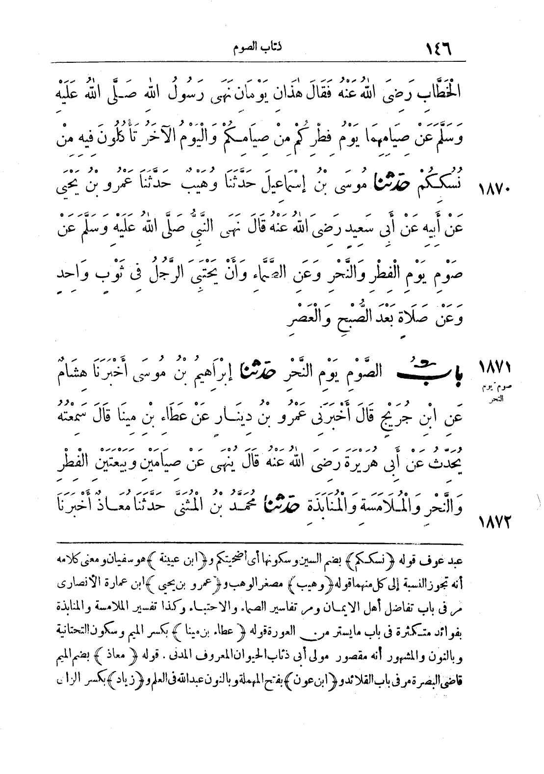 عبد عوف قوله {نسككم} بضم السين وسكونها أي أضحيتكم و {ابن عيينة} هو سفيان ومعنى كلامه أنه تجوز النسبة إلى كل منهما قوله {وهيب} مصغر وهب و {عمرو بن يحي} ابن عمارة الأنصاري مر في باب تفاضل أهل الإيمان ومر تفاسير الصماء والإحتباء وكذا تفسير الملامسة والمنابذة بفوائد متكثرة في باب ما يستر من العورة قوله {عطاء بن مينا} بكسر الميم وسكون التحتانية وبالنون والمشهور أنه مقصور مولى أبي ذئاب الحيوان المعروف المدني, قوله {معاذ} بضم الميم قاضي البصرة مر في باب القلائد و {ابن عون} بفتح المهملة وبالنون عبد الله في العلم و {زياد} بكسر الزاي