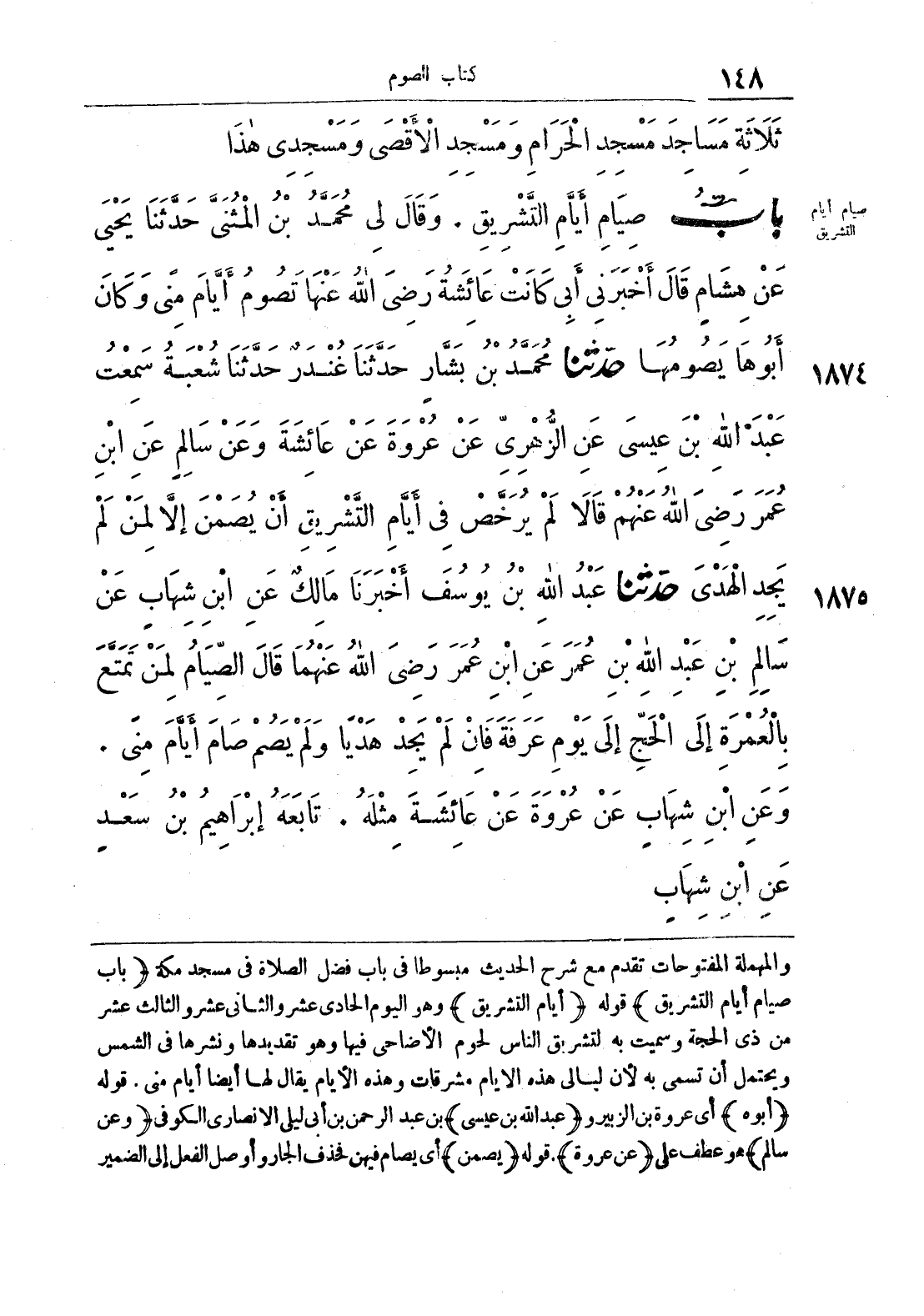 1874 - حَدَّثَنَا مُحَمَّدُ بْنُ بَشَّارٍ حَدَّثَنَا غُنْدَرٌ حَدَّثَنَا شُعْبَةُ سَمِعْتُ عَبْدَ اللَّهِ بْنَ عِيسى بْنِ أَبِي لَيْلَى عَنْ الزُّهْرِيِّ عَنْ عُرْوَةَ عَنْ عَائِشَةَ وَعَنْ سَالِمٍ عَنْ ابْنِ عُمَرَ رَضِيَ اللَّهُ عَنْهُمْ قَالَا لَمْ يُرَخَّصْ فِي أَيَّامِ التَّشْرِيقِ أَنْ يُصَمْنَ إِلَّا لِمَنْ لَمْ يَجِدْ الْهَدْيَ