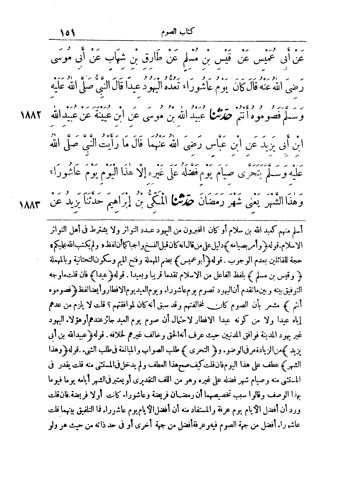 أسلم منهم كعبد الله بن سلام أو كان المخبرون من اليهود عدد التواتر ولا يشترط في أهل التواتر الإسلام, قوله {وأمر بصيامه} دليل على من قال أنه كان قبل النسخ واجبا كما أن لفظ «ولم يكتب الله عليكم» حجة للقائلين بعدم الوجوب, قوله {أبو عميس} بضم المهملة وفتح الميم وسكون التحتانية وبالمهملة {وقيس بن مسلم} بلفظ الفاعل من الإسلام تقدما قريبا وبعيدا, قوله {عيدا} فإن قلت ما وجه التوفيق بينه وبين ما تقدم أن اليهود تصوم يوم عاشوراء ويوم العيد يوم الإفطار وأيضا لفظ {فصوموه أنتم} مشعر بأن الصوم كان لمخالفتهم وقد سبق أنه كان لموافقتهم؟ قلت لا يلزم من عدهم إياه عيدا ولا من كونه عيدا الإفطار لاحتمال أن صوم يوم العيد جائز عندهم أو هؤلاء اليهود غير يهود المدينة فوافق المدنيين حيث أنه الحق وخالف غيرهم لخلافه, قوله {عبيد الله بن أبي يزيد} من الزيادة مر في الوضوء و {التحري} طلب الصواب والمبالغة في طلب الشيء , قوله {وهذا الشهر} عطف على هذا اليوم فإن قلت كيف صح هذا العطف ولم يدخل في المستثنى منه قلت يقدر في المستثنى منه وصيام شهر فضله على غيره وهو من اللف التقديري أو يعتبر في الشهر أيامه يوما فيوما بهذا الوصف وقالوا سبب تخصيصهما أن رمضان فريضة وعاشوراء كانت أولا فريضة, فإن قلت ورد أن أفضل الأيام يوم عرفة والمستفاد منه أن أفضل الأيام يوم عاشوراء فما التلفيق بينهما قلت عاشوراء أفضل من جهة الصوم فيه وعرفة أفضل من جهة أخرى أو في حد ذاته من حيث هو ولو