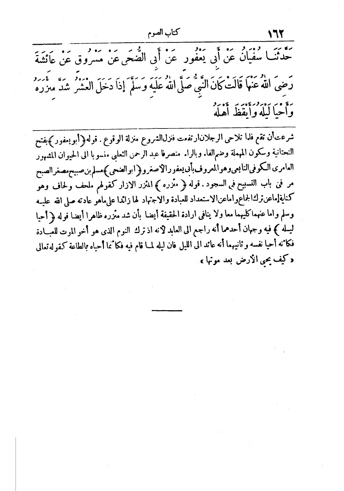 شرعت أن تقع فلما تلاحى الرجلان ارتفعت فنزل الشروع منزلة الوقوع, قوله {أبو يعفور} بفتح التحتانية وسكون المهملة وضم الفاء وبالراء منصرفا عبد الرحمن الثعلبي منسوبا إلى الحيوان المشهور العامري الكوفي التابعي وهو المعروف بأبي يعفور الأصغر و {أبو ضحى} مسلم بن صبيح مصغر الصبح مر في باب التسبيح في السجود, قوله {مئزره} المئزر الإزار كقولهم ملحف ولحاف وهو كناية إما عن ترك الجماع وإما عن الاستعداد للعبادة والاجتهاد لها زائد على ما هو عادته صلى الله عليه وسلم وإما عنهما كليهما معا ولا ينافي إرادة الحقيقة أيضا بأن شدة مئزره ظاهرا أيضا قوله {أحيا ليله} فيه وجهان أحدهما أنه راجع إلى العابد لأنه إذ ترك النوم الذي هو أخو الموت للعبادة فكأنه أحيا نفسه وثانيهما أنه عائد إلى الليل فإن ليله لما قام فيه فكأنما أحياه بالطاعة كقوله تعالى «كيف يحي الأرض بعد موتها»