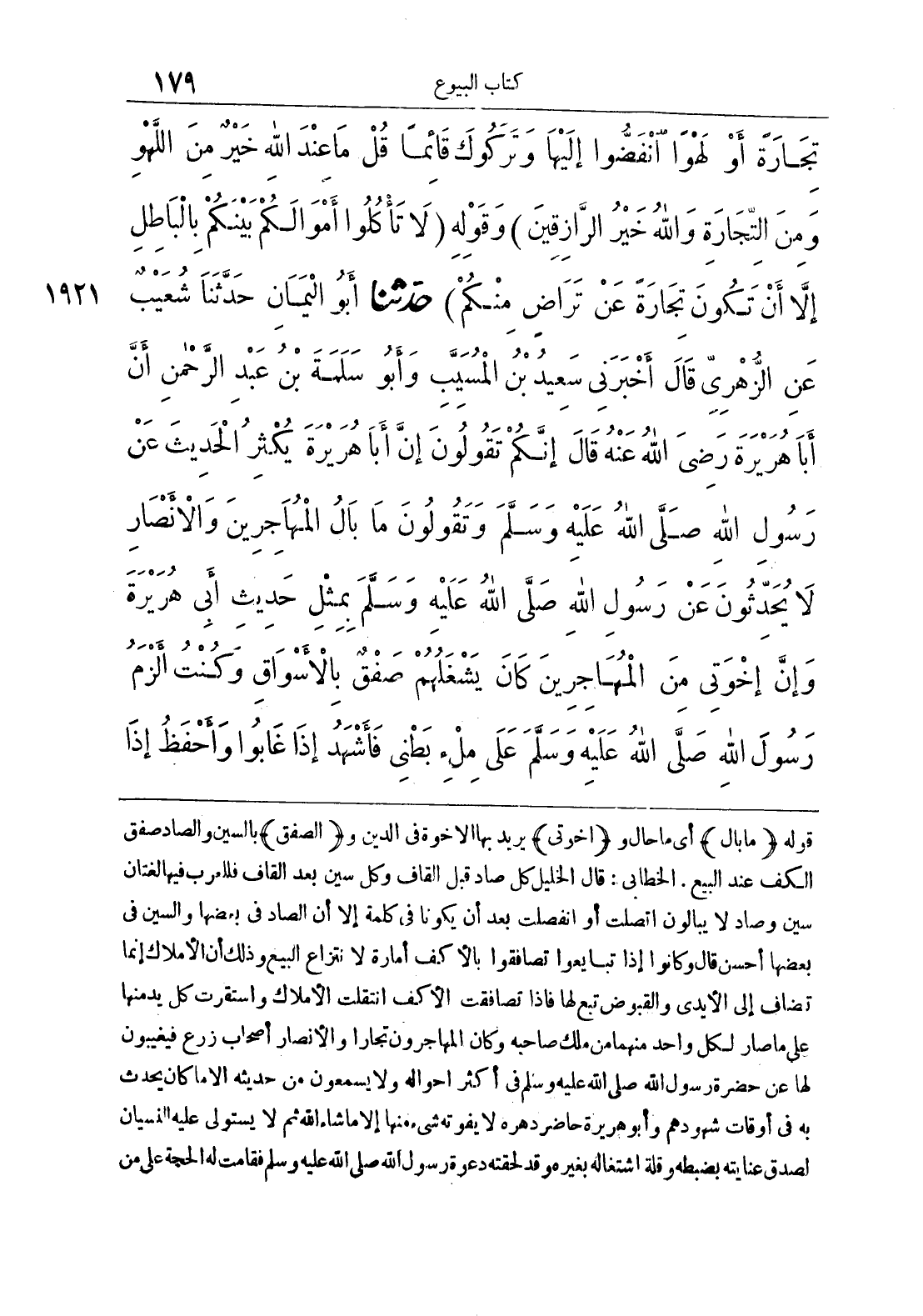 قوله {ما بال} أي ما حال و {إخوتي} يريد بها الإخوة في الدين و {الصفق} بالسين والصاد صفق الكف عند البيع, الخطابي: قال الخليل كل صاد قبل القاف وكل سين بعد القاف فللعرب فيها لغتان سين وصاد لا يبالون اتصلت أو انفصلت بعد أن يكونا في كلمة إلا أن الصاد في بعضها والسين في بعضها أحسن قال وكانوا إذا تبايعوا تصافقوا بالأكف أمارة لانتزاع البيع وذلك أن الأملاك إنما تضاف إلى الأيدي والقبوض تبع لها فإذا تصافقت الأكف انتقلت الأملاك واستقرت كل يدمنها على ما صار لكل واحد منهما من ملك صاحبه وكان المهاجرون تجارا والأنصار أصحاب زرع فيغيبون لها عن حضرة رسول الله صلى الله عليه وسلم في أكثر أحواله ولا يسمعون من حديثه إلا ما كان يحدث به في أوقات شهودهم وأبو هريرة حاضر دهره لا يفوته شيء منها إلا ما شاء الله ثم لا يستولي عليه النسيان لصدق عنايته بضبطه وقلة اشتغاله بغيره وقد لحقته دعوة رسول الله صلى الله عليه وسلم فقامت له الحجة على من