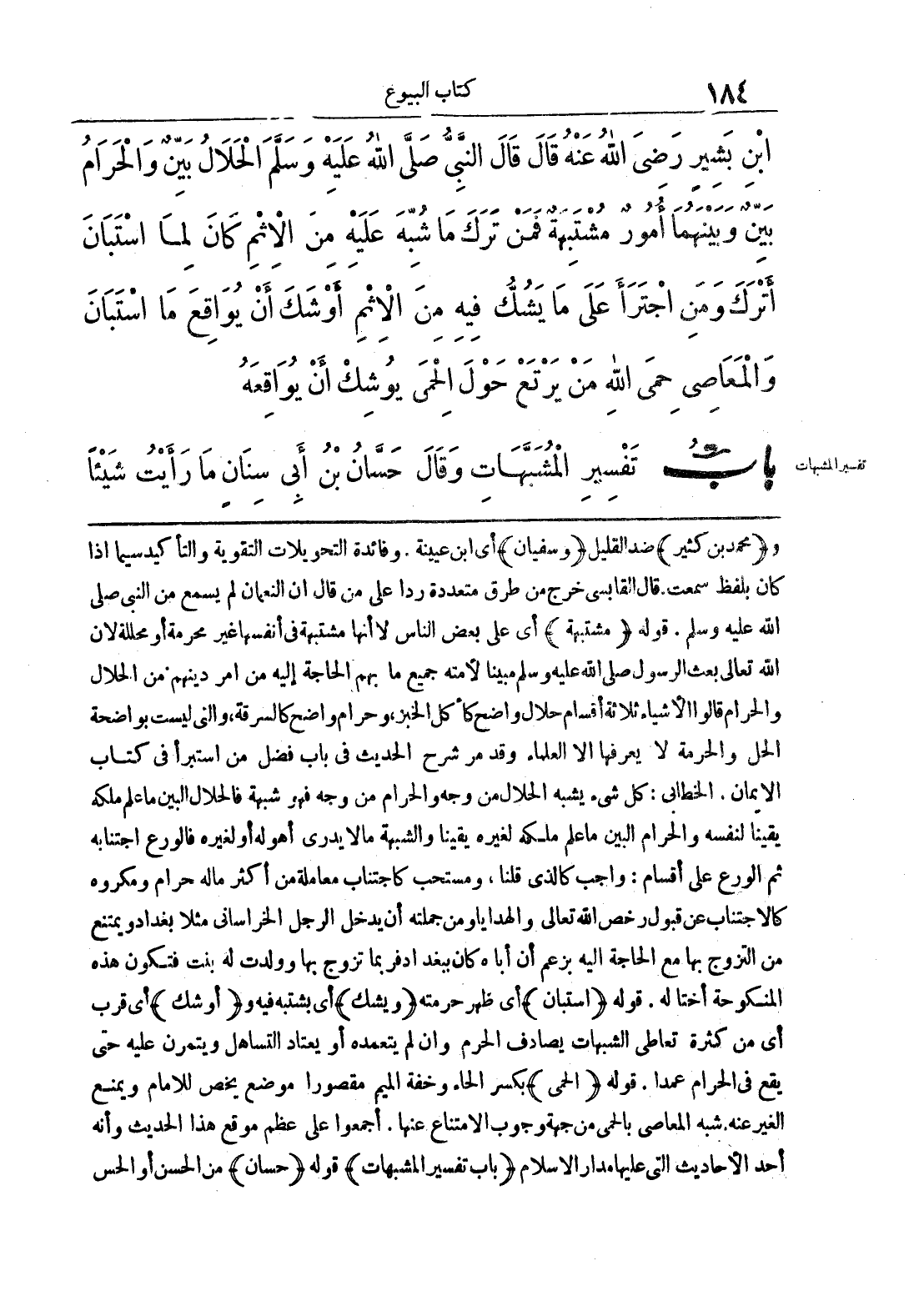 و {محمد بن كثير} ضد القليل {وسفيان} أي ابن عيينة, وفائدة التحويلات التقوية والتأكيد سيما إذا كان بلفظ سمعت, قال القابسي خرج من طرق متعددة ردا على من قال أن النعمان لم يسمع من النبي صلى الله عليه وسلم, قوله {مشتبهة} أي على بعض الناس لا أنها مشتبهة في أنفسها غير محرمة أو محللة لأن الله تعالى بعث الرسول صلى الله عليه وسلم مبينا لأمته جميع ما بهم الحاجة إليه من أمر دينهم من الحلال والحرام قالوا الأشياء ثلاثة أقسام حلال واضح كأكل الخبز, وحرام واضح كالسرقة, والتي ليست بواضحة الحل والحرمة لا يعرفها إلا العلماء وقد مر شرح الحديث في باب فضل من استبرأ في كتاب الإيمان, الخطابي: كل شيء يشبه الحلال من وجه والحرام من وجه فهو شبهة فالحلال البين ما علم ملكه يقينا لنفسه والحرام بين ما علم ملكه لغيره يقينا والشبهة مالا يدري أهو له أو لغيره فالورع اجتنابه ثم الورع على أقسام: واجب كالذي قلنا, ومستحب كاجتناب معاملة من أكثر ماله حرام ومكروه كالاجتناب عن قبول رخص الله تعالى والهدايا من جملته أن يدخل الرجل الخراساني مثلا بغداد ويمتنع من التزوج بها مع الحاجة إليه بزعم أن أباه كان ببغداد فربما تزوج بها وولدت له بنت فتكون هذه المنكوحة أختا له, قوله {استبان} أي ظهر حرمته {ويشك} أي يشبهه فيه و {أوشك} أي قرب أي من كثر تعاطي الشبهات يصادف الحرم وإن لم يتعمده أو يعتاد التساهل ويتمرن عليه حتى يقع في الحرام عمدا, قوله {الحمي} بكسر الحاء وخفة الميم مقصورا موضع يخص للإمام ويمنع الغير عنه, شبه المعاصي بالحمي من جهة وجوب الامتناع عنها, أجمعوا على عظم موقع هذا الحديث وأنه أحد الأحاديث التي عليها مدار الإسلام {باب تفسير المشتبهات} قوله {حسان} من الحسن أو الحس