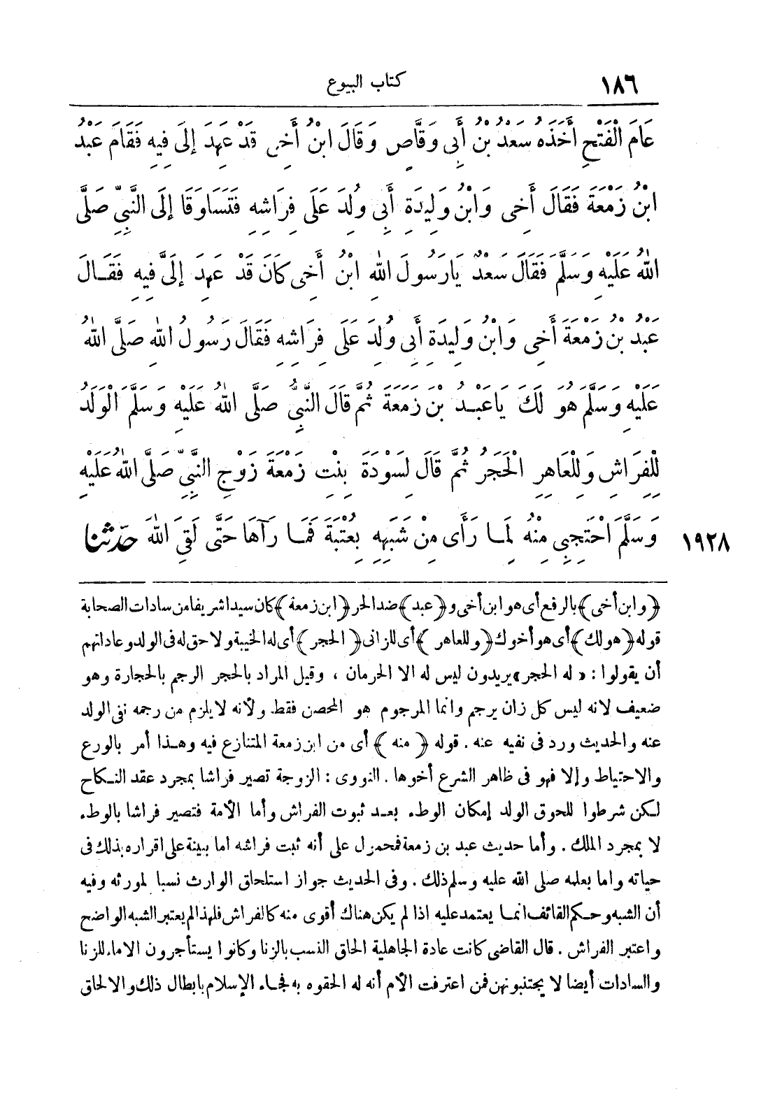عَامَ الْفَتْحِ أَخَذَهُ سَعْدُ بْنُ أَبِي وَقَّاصٍ وَقَالَ ابْنُ أَخِي قَدْ عَهِدَ إِلَيَّ فِيهِ فَقَامَ عَبْدُ بْنُ زَمْعَةَ فَقَالَ أَخِي وَابْنُ وَلِيدَةِ أَبِي وُلِدَ عَلَى فِرَاشِهِ فَتَسَاوَقَا إِلَى النَّبِيِّ صَلَّى اللَّهُ عَلَيْهِ وَسَلَّمَ فَقَالَ سَعْدٌ يَا رَسُولَ اللَّهِ ابْنُ أَخِي كَانَ قَدْ عَهِدَ إِلَيَّ فِيهِ فَقَالَ عَبْدُ بْنُ زَمْعَةَ أَخِي وَابْنُ وَلِيدَةِ أَبِي وُلِدَ عَلَى فِرَاشِهِ فَقَالَ رَسُولُ اللَّهِ صَلَّى اللَّهُ عَلَيْهِ وَسَلَّمَ هُوَ لَكَ يَا عَبْدُ بْنَ زَمْعَةَ ثُمَّ قَالَ النَّبِيُّ صَلَّى اللَّهُ عَلَيْهِ وَسَلَّمَ الْوَلَدُ لِلْفِرَاشِ وَلِلْعَاهِرِ الْحَجَرُ ثُمَّ قَالَ لِسَوْدَةَ بِنْتِ زَمْعَةَ زَوْجِ النَّبِيِّ صَلَّى اللَّهُ عَلَيْهِ وَسَلَّمَ احْتَجِبِي مِنْهُ لِمَا رَأَى مِنْ شَبَهِهِ بِعُتْبَةَ فَمَا رَآهَا حَتَّى لَقِيَ اللَّهَ