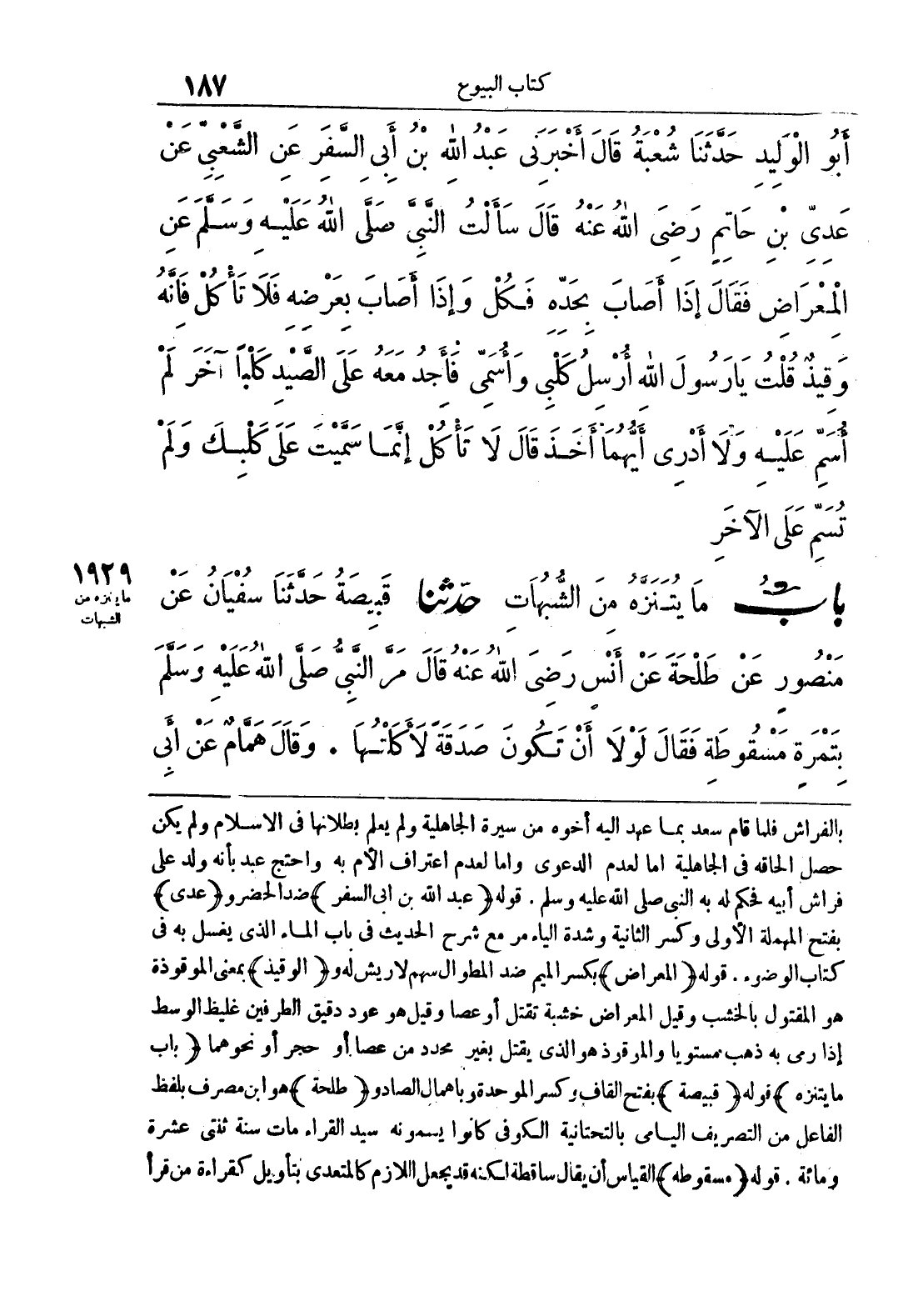 بالفراش فلما قام سعد بما عهد إليه أخوه من سيرة الجاهلية ولم يعلم بطلانها في الإسلام ولم يكن حصل إلحاقه في الجاهلية إما لعدم دعوى وإما لعدم اعتراف الأم به واحتج عبد بأنه ولد على فراش أبيه فحكم له به النبي صلى الله عليه وسلم, قوله {عبد الله بن أبي السفر} ضد الحضر و {عدي} بفتح المهملة الأولى وكسر الثانية وشدة الياء مر مع شرح الحديث في باب الماء الذي يغسل به في كتاب الوضوء, قوله {المعراض} بكسر الميم ضد المطوال سهم لا ريش له و {الوقيذ} بمعنى الموقوذة هو المقتول بالخشب وقيل المعراض خشبة تقتل أو عصا وقيل هو عود دقيق الطرفين غليظ الوسط إذا رمي به ذهب مستويا والموقوذ يقتل بغير محدد من عصا أو حجر أو نحوهما {باب ما يتنزه} قوله {قبيصة} بفتح القاف وكسر الموحدة وبإهمال الصاد و {طلحة} هو ابن مصرف بلفظ الفاعل من التصريف اليامي بالتحتانية الكوفي كانوا يسمونه سيد القراء مات سنة ثنتي عشرة ومائة, قوله {مسقوطة} القياس أن يقال ساقطة لكنه قد يجعل اللازم كالمتعدي بتأويل كقراءة من قرأ
