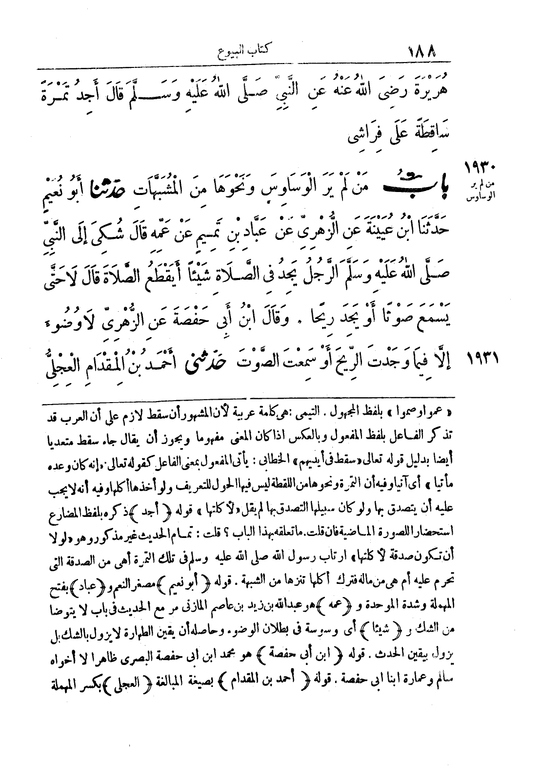 «عموا وصموا» بلفظ المجهول, التيمي: هي كلمة عربية لأن المشهور أن سقط لازم على أن العرب قد تذكر الفاعل بلفظ المفعول وبالعكس إذا كان المعني مفهوما ويجوز أن يقال جاء سقط متعديا أيضا بدليل قوله تعالى «سقط في أيديهم» الخطابي: يأتي المفعول بمعنى الفاعل كقوله تعالى «إنه كان وعده مأتيا» أي آتيا وفيه أن التمرة ونحوها من اللقطة ليس فيها الحول للتعريف ولو أخذها أكلها وفيه أنه لا يجب عليه أن يتصدق بها ولو كان سبيلها التصدق بها لم يقل «أجد» ذكره بلفظ المضارع استحضار الصورة الماضية فإن قلت, ما تعلقه بهذا الباب؟ قلت: تمام الحديث غير مذكور وهو «لولا أن تكون صدقة لأكلتها» ارتاب رسول الله صلى الله عليه وسلم في تلك التمرة أهي من الصدقة التي تحرم عليه أم هي من ماله فترك أكلها تنزها من شبهة, قوله {أبو نعيم} مصغر النعم و {عباد} بفتح المهملة وشدة الموحدة و {عمه} هو عبد الله بن زيد بن عاصم المازني مر مع حديث في باب لا يتوضأ من شك و {شيئا} أي وسوسة في بطلان الوضوء وحاصله أن يقين الطهارة لا يزول بالشك بل يزول بيقين الحدث, قوله {ابن أبي حفصة} هو محمد ابن أبي حفصة البصري ظاهرا لا أخواه سالم وعمارة ابنا أبي حفصة, قوله {أحمد بن المقدام} بصيغة المبالغة {العجلي} بكسر المهملة