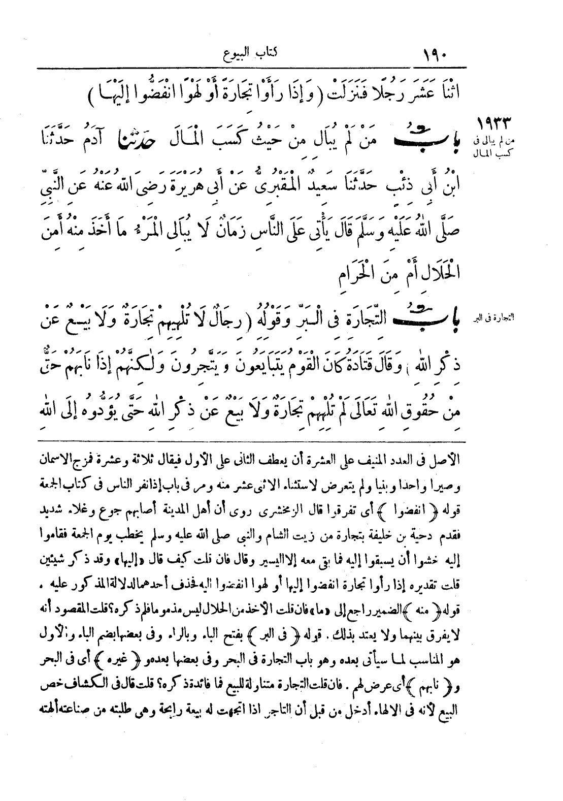 الأصل في العدد المنيف على العشرة أن يعطف الثاني على الأول فيقال ثلاثة وعشرة فمزج الاسمان وصيرا واحدا وبنيا ولم يعترض لاستثناء الاثني عشرة منه ومر في باب إذا نفر الناس في كتاب الجمعة قوله {انفضوا} أي تفرقوا قال الزمخشري روى أن أهل المدينة أصابهم جوع وغلاء شديد فقدم دحية بن خليفة بتجارة من زيت الشام والنبي صلى الله عليه وسلم يخطب يوم الجمعة فقاموا إليه خشوا أن يسبقوا إليه فما بقي معه إلا اليسير وقال فإن قلت كيف قال «إليها» وقد ذكر شيئين قلت تقديره إذا رأوا تجارة انفضوا إليها أولهوا انفضوا إليه فحذف أحدهما لدلالة المذكور عليه, قوله {منه} الضمير راجع إلى «ما» فإن قلت الأخذ من الحلال ليس مذموما فلم ذكره؟ قلت المقصود أنه لا يفرق بينهما ولا يعتد بذلك, قوله {في البر} بفتح الباء وبالراء وفي بعضها بضم الباء والأول هو المناسب لما سيأتي بعده وهو باب التجارة في البحر وفي بعضها بعده و {غيره} أي في البحر و {نابهم} أي عرض لهم, فإن قلت التجارة متناولة للبيع فما فائدة ذكره؟ قلت قال في الكشاف خص البيع لأنه في الإلهاء أدخل من قبل أن التاجر إذا اتجهت له بيعة رابحة وهي طلبته من صناعته ألهته