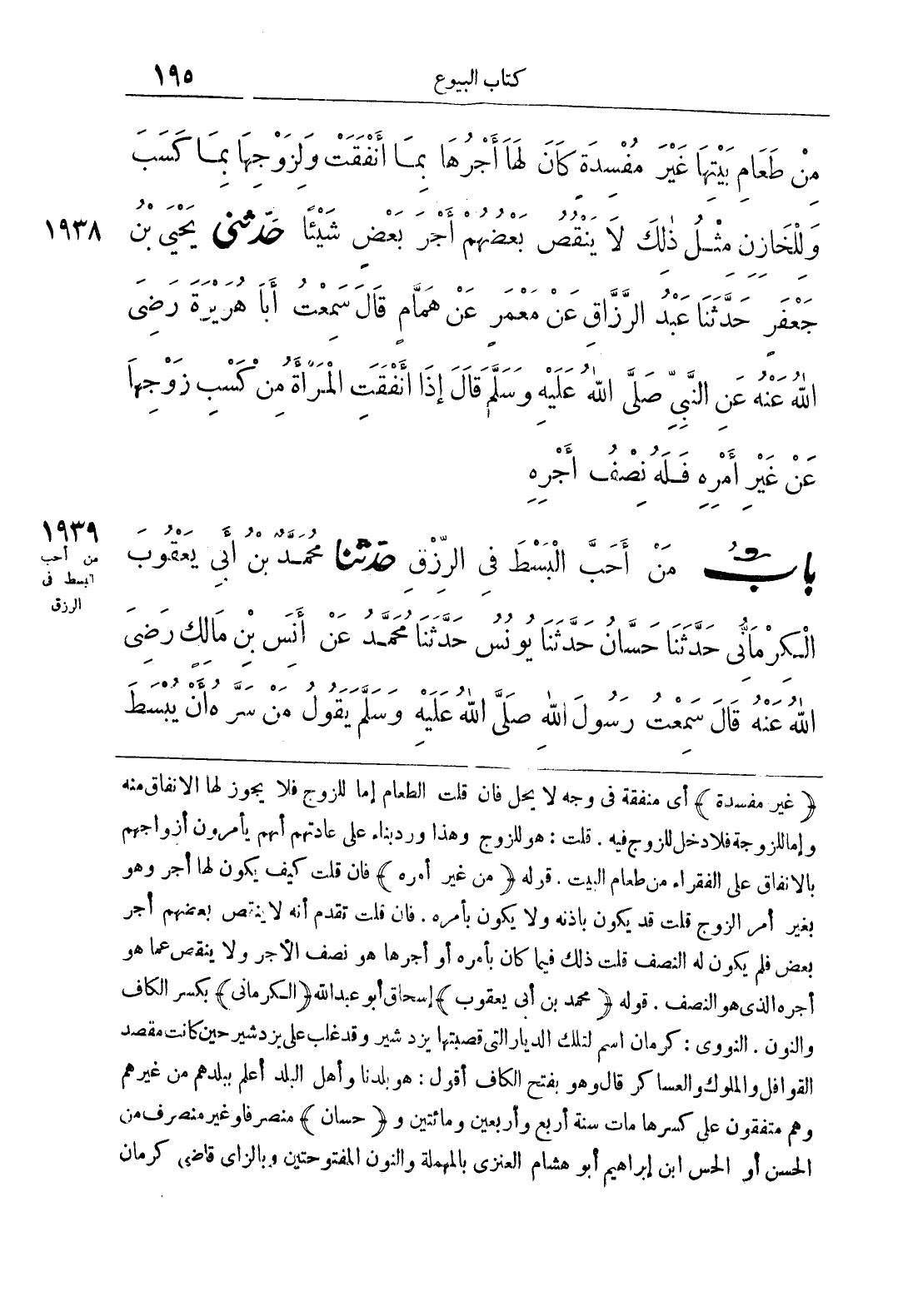 {غير مفسدة} أي منفقة في وجه لا يحل فإن قلت الطعام إما للزوج فلا يجوز لها الإنفاق منه وإما للزوجة فلا دخل للزوج فيه, قلت: هو للزوج وهذا ورد بناء على عادتهم أهم يأمرون أزواجهم بالإنفاق على الفقراء من طعام البيت, قوله {من غير أمره} فإن قلت كيف يكون لها أجر وهو بغير أمر الزوج قلت قد يكون بإذنه ولا يكون بأمره, فإن قلت تقدم أنه لا ينقص بعضهم أجر بعض فلم يكون له النصف قلت ذلك فيما كان بأمره أو أجرها هو نصف الأجر ولا ينقص عما هو أجره الذي هو النصف, قوله {محمد بن أبي يعقوب} إسحاق أبو عبد الله {الكرماني} بكسر الكاف والنون, النووي: كرمان اسم لتلك الديار التي قصبتها يزدشير وقد غلب على يزدشير حين كانت مقصد القوافل والملوك والعساكر قال وهو بفتح الكاف أقول: هو بلدنا وأهل البلد أعم ببلدهم من غيرهم وهو متفقون على كسرها مات سنة أربع وأربعين ومائتين و {حسان} منصرفا وغير منصرف من الحسن أو الحس ابن إبراهيم أبو هشام العنزي بالمهملة والنون المفتوحتين وبالزاي قاضي كرمان