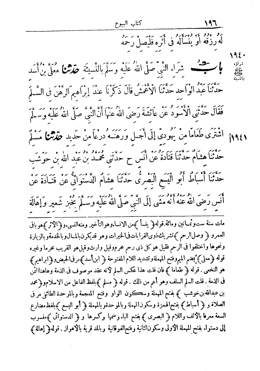 مات سنة ست وثمانين ومائة, قوله {ينسأ} من الإنساء وهو التأخير ومنه النسئ و {الأثر} هو باقي العمر و {وصل الرحم} تشريك ذوي القرابات في الخيرات وهو قد يكون بالمال وبالخدمة وبالزيارة ونحوها واختلفوا في الرحم فقيل هو كل ذي رحم محرم وقيل وارث وقيل هو القريب محرما وغيره قوله {معلي} بضم الميم وفتح المهملة وتشديد اللام المفتوحة {ابن أسد} مر في الحيض و {إبراهيم} هو النخعي, قوله {طعاما} فإن قلت هذا عكس السلم لأنه عقد موصوف في الذمة وهاهنا الثمن في الذمة, قلت السلم السلف وهو أعم من ذلك, قوله {مسلم} بلفظ الفاعل من الإسلام و {محمد بن عبد الله بن خوشب} بفتح المهملة وسكون الواو وفتح المعجمة وبالموحدة الطائفي مر في الصلاة و {أسباط} بفتح الهمزة وسكون المهملة وبالموحدة وبالمهملة {أبو اليسع} بلفظ مضارع السعة معرفا بالألف واللام {البصري} بفتح الباء وضمها وكسرها و {الدستوائي} منسوب إلى دستواء بفتح المهملة الأولى وسكون الثانية وفتح الفوقانية وبالمد قرية بالأهواز, قوله {إهالة}