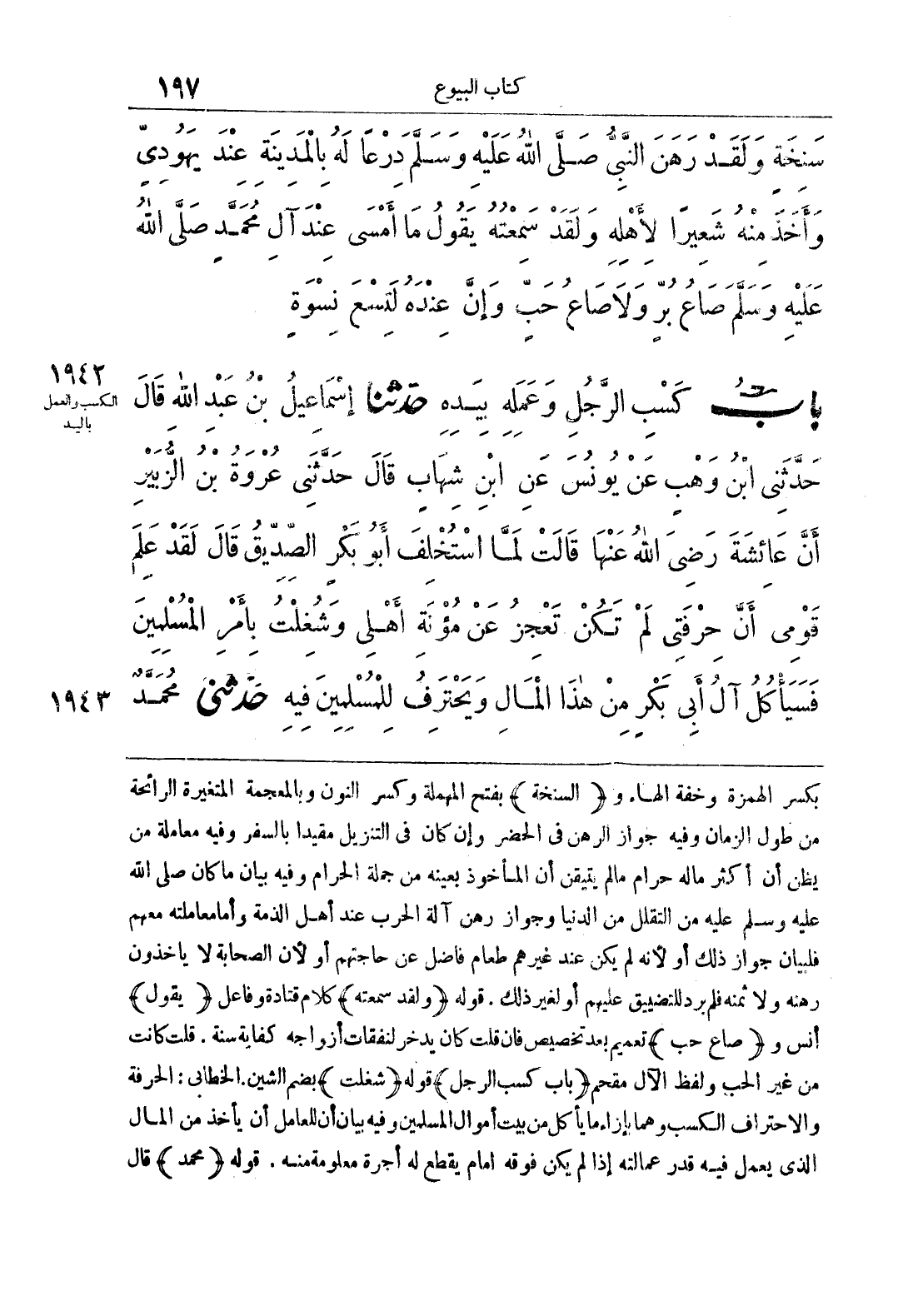 بكسر الهمزة وخفة الهاء و {السنخة} بفتح المهملة وكسر النون وبالمعجمة المتغيرة الرائحة من طول الزمان وفيه جواز الرهن في الحضر وإن كان في التنزيل مقيدا بالسفر وفيه معاملة من يظن أن أكثر ماله حرام ما لم يتيقن أن المأخوذ بعينه من جملة الحرام وفيه بيان ما كان صلى الله عليه وسلم عليه من التقلل من الدنيا وجواز رهن آلة الحرب عند أهل الذمة وأما معاملته معهم فلبيان جواز ذلك أو لأنه لم يكن عند غيرهم طعام فاضل عن حاجتهم أو لأن الصحابة لا يأخذون رهنه ولا ثمنه فلم يرد للتضييق عليهم أو لغير ذلك, قوله {ولقد سمعته} كلام قتادة وفاعل {يقول} أنس و {صاع حب} تعميم بعد تخصيص فإن قلت كان يدخر لنفقات أزواجه كفاية سنة, قلت كانت من غير ولفظ الآل مقحم {باب كسب الرجل} قوله {شغلت} بضم الشين, الخطابي: الحرفة والاحتراف الكسب وهما بإزاء ما يأكل من بيت أموال المسلمين وفيه بيان أن للعامل أن يأخذ من المال الذي يعمل فيه قدر عمالته إذا لم يكن فوقه امام يقطع له أجرة معلومة منه, قوله {محمد} قال