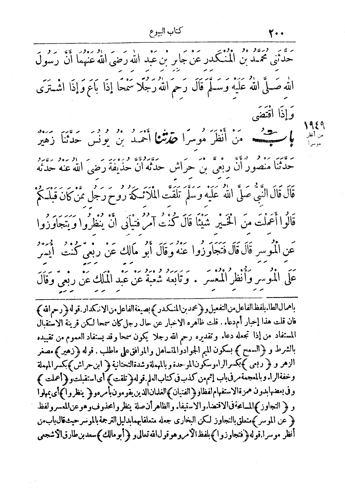 بإهمال الطاء بلفظ الفاعل من التفعيل و {محمد بن المنكدر} بصيغة الفاعل من الإنكدار, قوله {رحم الله} فإن قلت هذا إخبار أم دعاء, قلت ظاهره الإخبار عن حال رجل كان سمحا لكن قرينة الاستقبال المستفاد من إذا تجعله دعاء وتقديره رحم الله رجلا يكون سمحا وقد يستفاد العموم من تقييده بالشرط و {السمح} بسكون الميم الجواد والمتساهل والموافق على ما طلب, قوله {زهير} مصغر الزهر و {ربعي} بكسر الراء وسكون الموحدة وبالمهملة وشدة التحتانية {ابن حراش} بكسر المهملة وخفة الراء وبالمعجمة مر في باب إثم من كذب في كتاب العلم, قوله {تلقت} أي استقبلت و {أعملت} وفي بعضها بدون همزة الاستفهام لفظا و {الفتيان} الغلمان الذين يقومون بأمره و {ينظروا} أي يمهلوا و {التجاوز} المسامحة في الاقتضاء والاستيفاء والظاهر أن صلة ينظروا محذوف وهو عن المعسر ولفظ {عن الموسر} متعلق بالتجاوز لكن البخاري جعله متعلقا بهما بدليل الترجمة بالموسر حيث قال باب من أنظر موسرا, قوله {فتجاوزوا} بلفظ الأمر وهو قول الله تعالى و {أبو مالك} سعد بن طارق الأشجعي