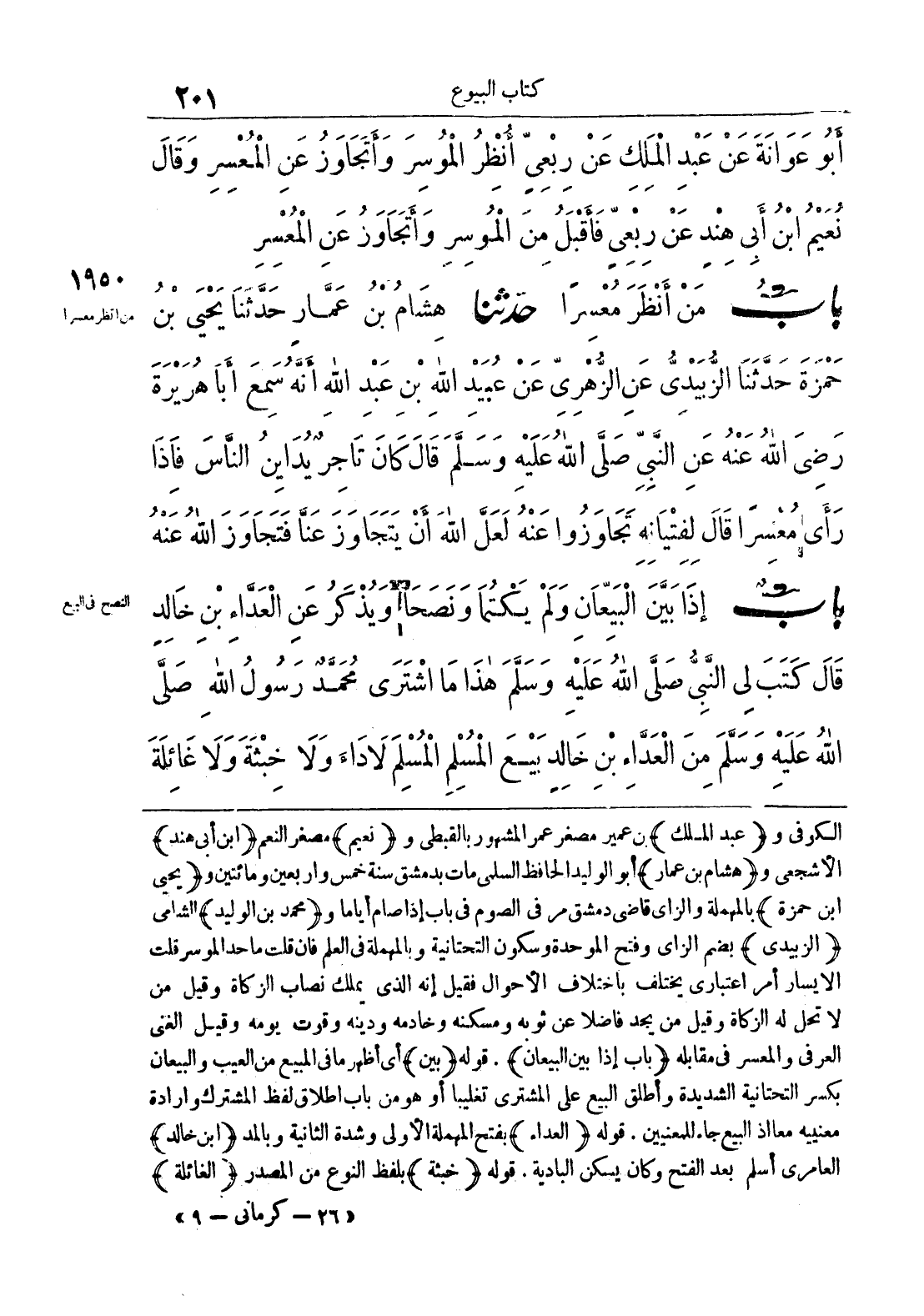 الكوفي و {عبد الملك} بن عميرة مصغر عمر المشهور بالقبطي و {نعيم} مصغر النعم {ابن أبي هند} الأشجعي و {هشام بن عمار} أبو الوليد الحافظ السلمي مات بدمشق سنة خمس وأربعين ومائتين و {يحي ابن حمزة} بالمهملة والزاي قاضي دمشق مر في الصوم في باب إذا صام أياما و {محمد بن الوليد} الشامي {الزبيدي} بضم الزاي وفتح الموحدة وسكون التحتانية وبالمهملة في العلم فإن قلت ما حد الموسر قلت الأيسار أمر اعتباري يختلف باختلاف الأحوال فقيل إنه الذي يملك نصاب الزكاة وقيل من لا تحل الزكاة وقيل من يجد فاضلا عن ثوبه ومسكنه وخادمه ودينه وقوت يومه وقيل الغني العرفي والمعسر في مقابله {باب إذا بين البيعان} , قوله {بين} أي أظهر ما في المبيع من العيب والبيعان بكسر التحتانية الشديدة وأطلق البيع على المشتري تغليبا أو هو من باب إطلاق لفظ المشترك وإرادة معنييه معا إذ البيع جاء للمعنيين, قوله {العداء} بفتح المهملة الأولى وشدة الثانية وبالمد {ابن خالد} العامري أسلم بعد الفتح وكان يسكن البادية, قوله {خبثة} بلفظ النوع من المصدر {الغائلة}