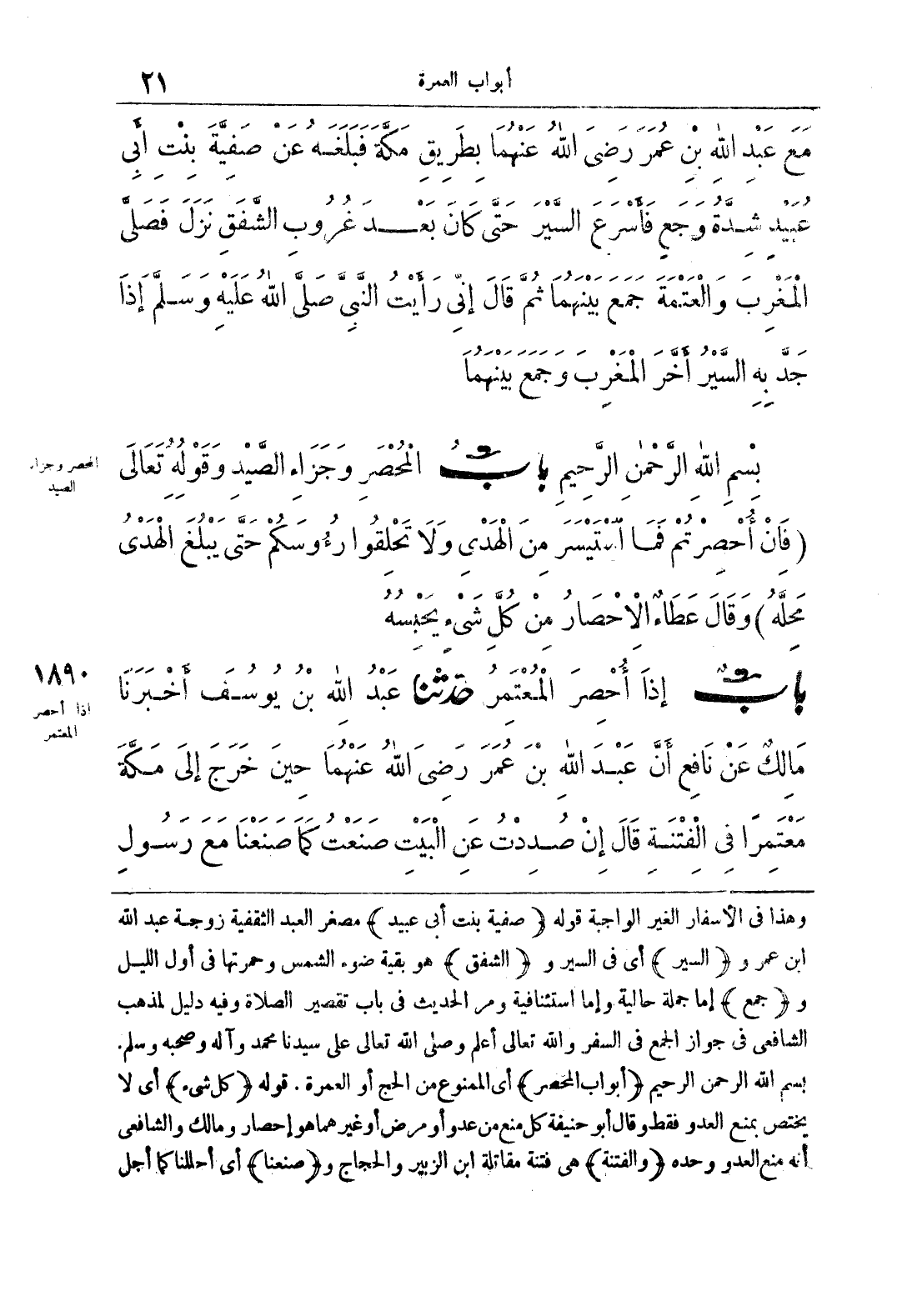 وهذا في الأسفار الغير الواجبة قوله {صفية بنت أبي عبيد} مصغر العبد الثقفية زوجة عبد الله ابن عمر و {السير} أي في السير و {الشفق} هو بقية ضوء الشمس وحمرتها في أول الليل و {الجمع} إما جملة حالية وإما استئنافية ومر الحديث في باب تقصير الصلاة وفيه دليل لمذهب الشافعي في جواز الجمع في السفر والله تعالى أعلم وصلى الله تعالى على سيدنا محمد وآله وصحبه وسلم, بسم الله الرحمن الرحيم {أبواب المحصر} أي الممنوع من الحج أو العمرة, قوله {كل شيء} أي لا يختص بمنع العدو فقط وقال أبو حنيفة كل منع من عدو أو مرض أو غيرهما هو إحصار ومالك والشافعي أنه منع العدو وحده {والفتنة} هي فتنة مقاتلة ابن الزبير والحجاج و {صنعنا} أي أحللنا كما أجل