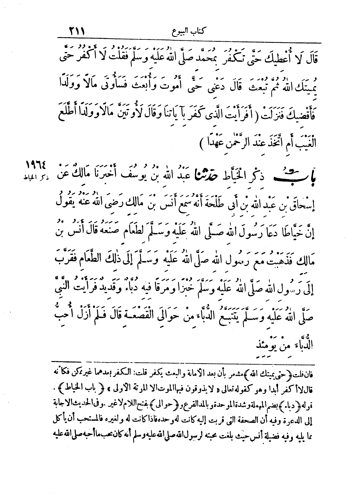 فإن قلت {حتى يميتك الله} مشعر بأن بعد الأمانة والبعث يكفر قلت: الكفر بعدهما غير ممكن فكأنه قال لا أكفر أبدا وهو كقوله تعالى «لا يذوقون فيها الموت إلا الموتة الأولى» {باب الخياط} , قوله {دباء} بضم المهملة وشدة الموحدة وبالمد القرع و {حوالي} بفتح اللام لا غير, وفي الحديث الإجابة إلى الدعوة وفيه أن الصحفة التي قربت إليه كانت له وحده فإذا كانت له ولغيره فالمستحب أن يأكل مما يليه وفيه فضيلة أنس حيث بلغت محبته لرسول الله صلى الله عليه وسلم أنه كان يحب ما أحبه صلى الله عليه