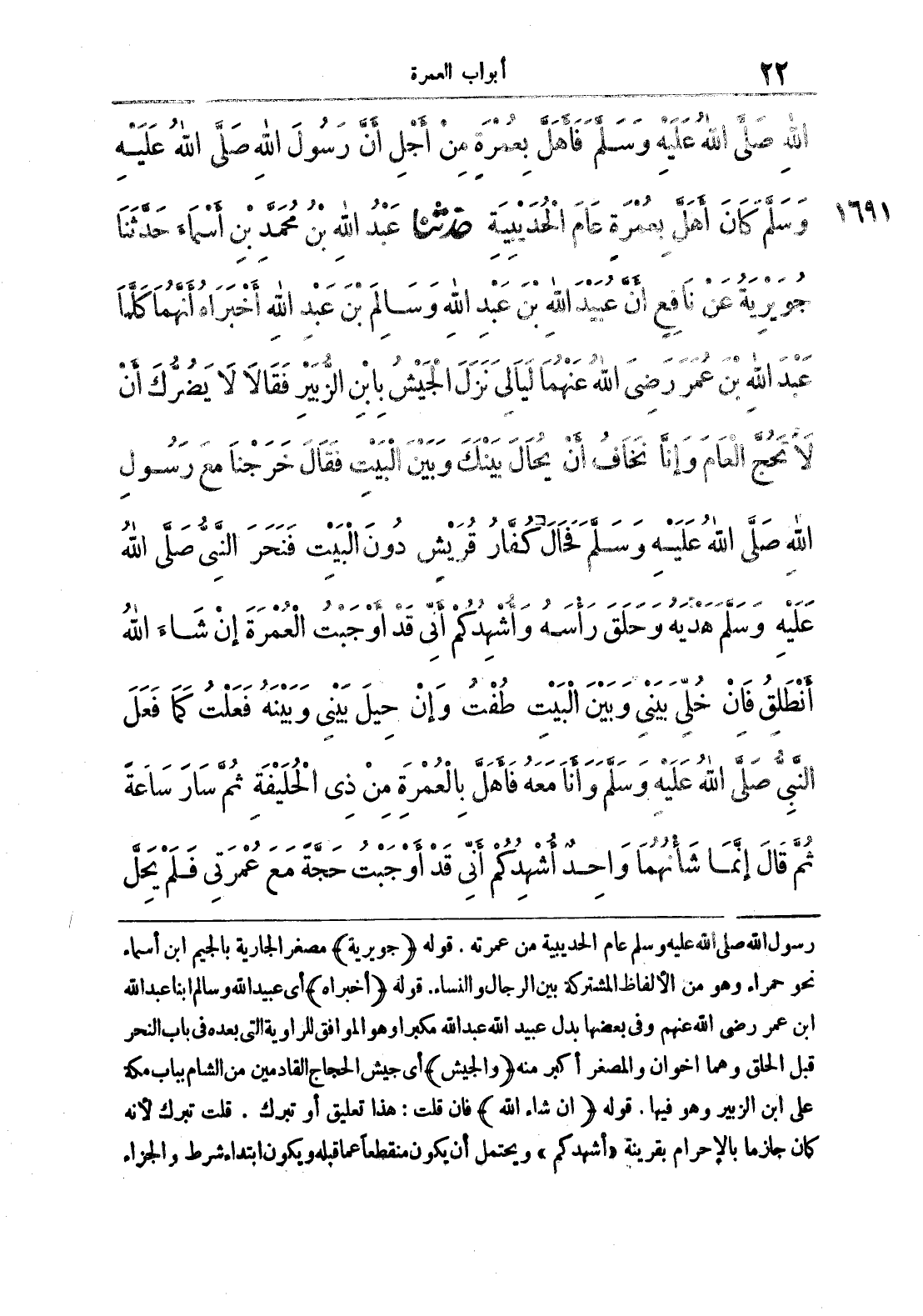 1691 - حَدَّثَنَا عَبْدُ اللَّهِ بْنُ مُحَمَّدِ بْنِ أَسْمَاءَ حَدَّثَنَا جُوَيْرِيَةُ عَنْ نَافِعٍ أَنَّ عُبَيْدَ اللَّهِ بْنَ عَبْدِ اللَّهِ وَسَالِمَ بْنَ عَبْدِ اللَّهِ أَخْبَرَاهُ أَنَّهُمَا كَلَّمَا عَبْدَ اللَّهِ بْنَ عُمَرَ رَضِيَ اللَّهُ عَنْهُمَا لَيَالِيَ نَزَلَ الْجَيْشُ بِابْنِ الزُّبَيْرِ فَقَالَا لَا يَضُرُّكَ أَنْ لَا تَحُجَّ الْعَامَ وَإِنَّا نَخَافُ أَنْ يُحَالَ بَيْنَكَ وَبَيْنَ الْبَيْتِ فَقَالَ خَرَجْنَا مَعَ رَسُولِ اللَّهِ صَلَّى اللَّهُ عَلَيْهِ وَسَلَّمَ فَحَالَ كُفَّارُ قُرَيْشٍ دُونَ الْبَيْتِ فَنَحَرَ النَّبِيُّ صَلَّى اللَّهُ عَلَيْهِ وَسَلَّمَ هَدْيَهُ وَحَلَقَ رَاسَهُ وَأُشْهِدُكُمْ أَنِّي قَدْ أَوْجَبْتُ الْعُمْرَةَ إِنْ شَاءَ اللَّهُ أَنْطَلِقُ فَإِنْ خُلِّيَ بَيْنِي وَبَيْنَ الْبَيْتِ طُفْتُ وَإِنْ حِيلَ بَيْنِي وَبَيْنَهُ فَعَلْتُ كَمَا فَعَلَ النَّبِيُّ صَلَّى اللَّهُ عَلَيْهِ وَسَلَّمَ وَأَنَا مَعَهُ فَأَهَلَّ بِالْعُمْرَةِ مِنْ ذِي الْحُلَيْفَةِ ثُمَّ سَارَ سَاعَةً ثُمَّ قَالَ إِنَّمَا شَانُهُمَا وَاحِدٌ أُشْهِدُكُمْ أَنِّي قَدْ أَوْجَبْتُ حَجَّةً مَعَ عُمْرَتِي فَلَمْ يَحِلَّ