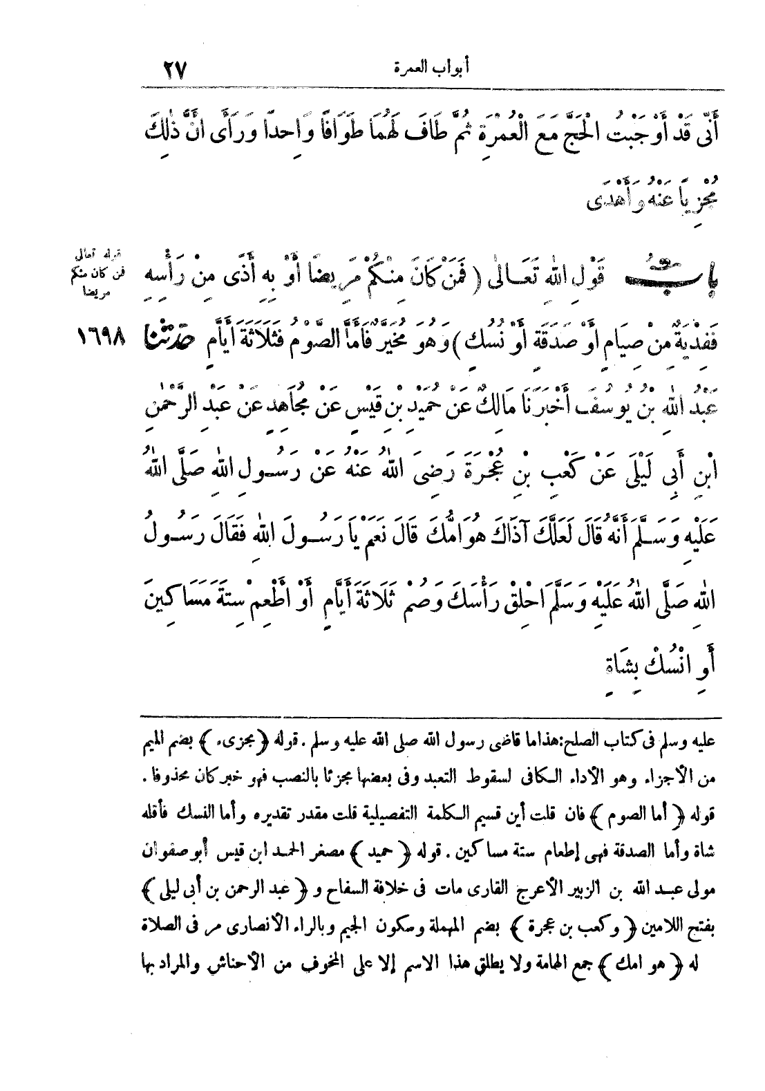 1698 - حَدَّثَنَا عَبْدُ اللَّهِ بْنُ يُوسُفَ أَخْبَرَنَا مَالِكٌ عَنْ حُمَيْدِ بْنِ قَيْسٍ عَنْ مُجَاهِدٍ عَنْ عَبْدِ الرَّحْمَنِ بْنِ أَبِي لَيْلَى عَنْ كَعْبِ بْنِ عُجْرَةَ رَضِيَ اللَّهُ عَنْهُ عَنْ رَسُولِ اللَّهِ صَلَّى اللَّهُ عَلَيْهِ وَسَلَّمَ أَنَّهُ قَالَ لَعَلَّكَ آذَاكَ هَوَامُّكَ قَالَ نَعَمْ يَا رَسُولَ اللَّهِ فَقَالَ رَسُولُ اللَّهِ صَلَّى اللَّهُ عَلَيْهِ وَسَلَّمَ احْلِقْ رَاسَكَ وَصُمْ ثَلَاثَةَ أَيَّامٍ أَوْ أَطْعِمْ سِتَّةَ مَسَاكِينَ أَوْ انْسُكْ بِشَاةٍ