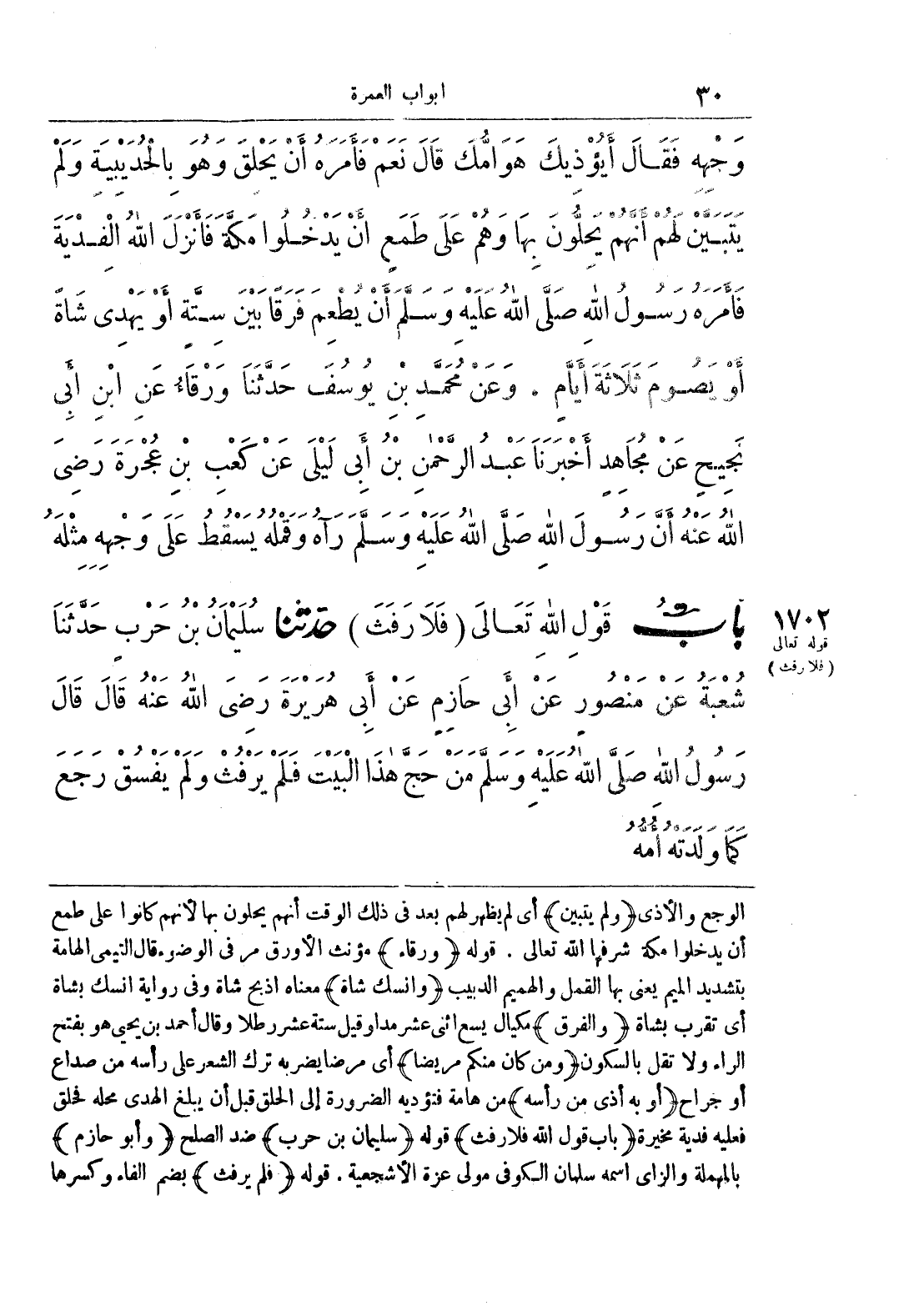الوجع والأذى {ولم يتبين} أي لم يظهر لهم بعد في ذلك الوقت أنهم يحلون بها لأنهم كانوا على طمع أن يدخلوا مكة شرفها الله تعالى, قوله {ورقاء} مؤنث الأوراق مر في الوضوء قال التيمي الهامة بتشديد الميم يعني بها القمل والهميم الدبيب {وانسك الشاة} معناه اذبح شاة وفي رواية انسك بشاة أي تقرب بشاة {والفرق} مكيال يسع اثني عشر مدا وقيل ستة عشر رطلا وقال أحمد بن يحي هو بفتح الراء ولا تقل بالسكون {ومن كان منكم مريضا} أي مرضا يضربه ترك الشعر على رأسه من صداع أو جراح {أو به أذى من رأسه} من هامة فتؤديه الضرورة إلى الحلق قبل أن يبلغ الهدى محله فحلق فعليه فدية مخيرة {باب قول الله فلا رفث} قوله {سليمان بن حرب} ضد الصلح {وأبو حازم} بالمهملة والزاي اسمه سلمان الكوفي مولى عزة الأشجعية, قوله {فلم يرفث} بضم الفاء وكسرها