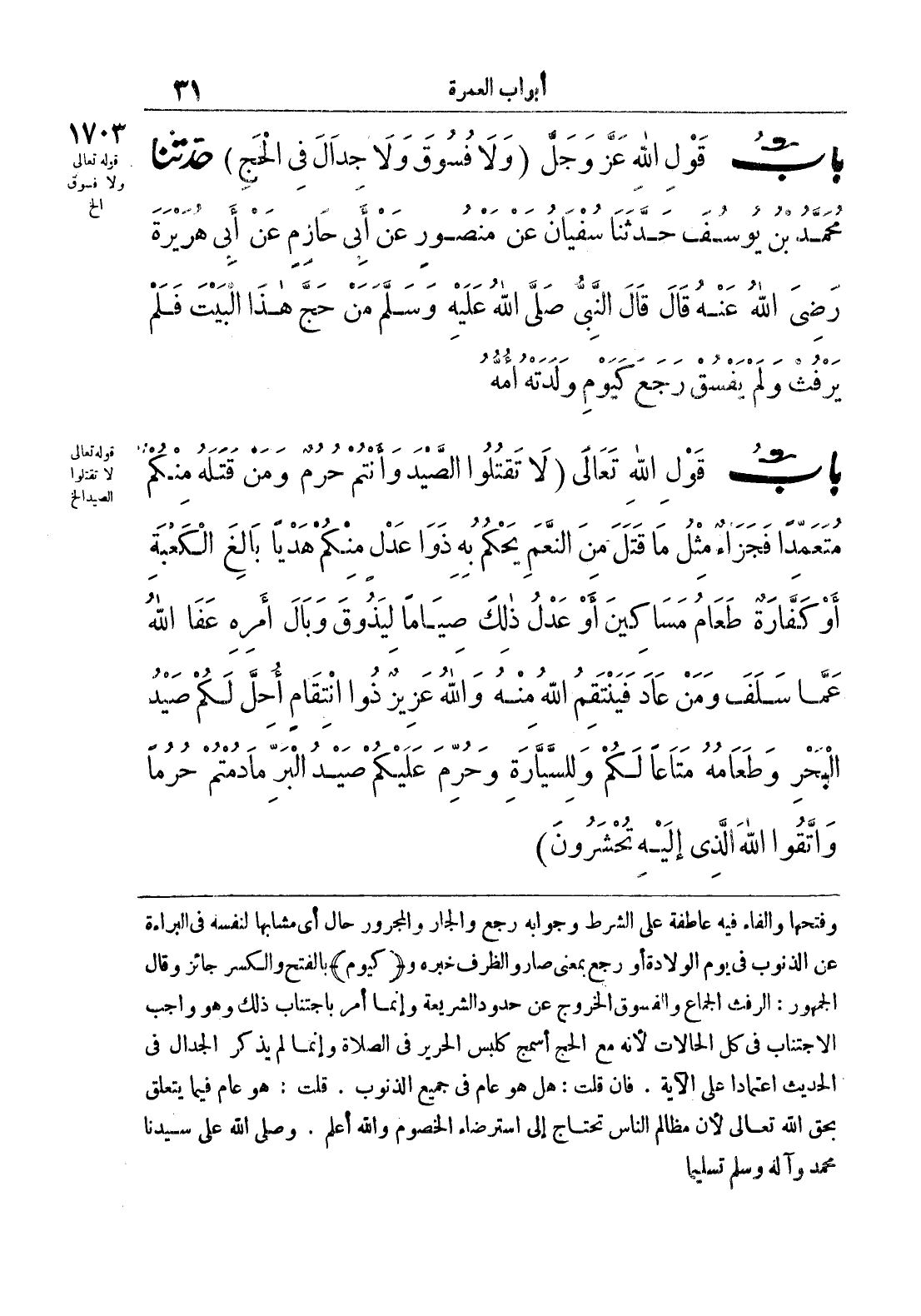 وفتحها والفاء فيه عاطفة على الشرط وجوابه رجع والجار والمجرور حال أي مشابها لنفسه في البراءة عن الذنوب في يوم الولادة أو رجع بمعنى صار والظرف خبره و {كيوم} بالفتح والكسر جائز وقال الجمهور: الرفث الجماع والفسوق الخروج عن حدود الشريعة وإنما أمر باجتناب ذلك وهو واجب الاجتناب في كل الحالات لأنه مع الحج أسمج كلبس الحرير في الصلاة وإنما لم يذكر الجدال في الحديث اعتمادا على الآية, فإن قلت: هل هو عام في جميع الذنوب , قلت: هو عام فيما يتعلق بحق الله تعالى لأن مظالم الناس تحتاج إلى استرضاء الخصوم والله أعلم, وصلى الله على سيدنا محمد وآله وسلم تسليما