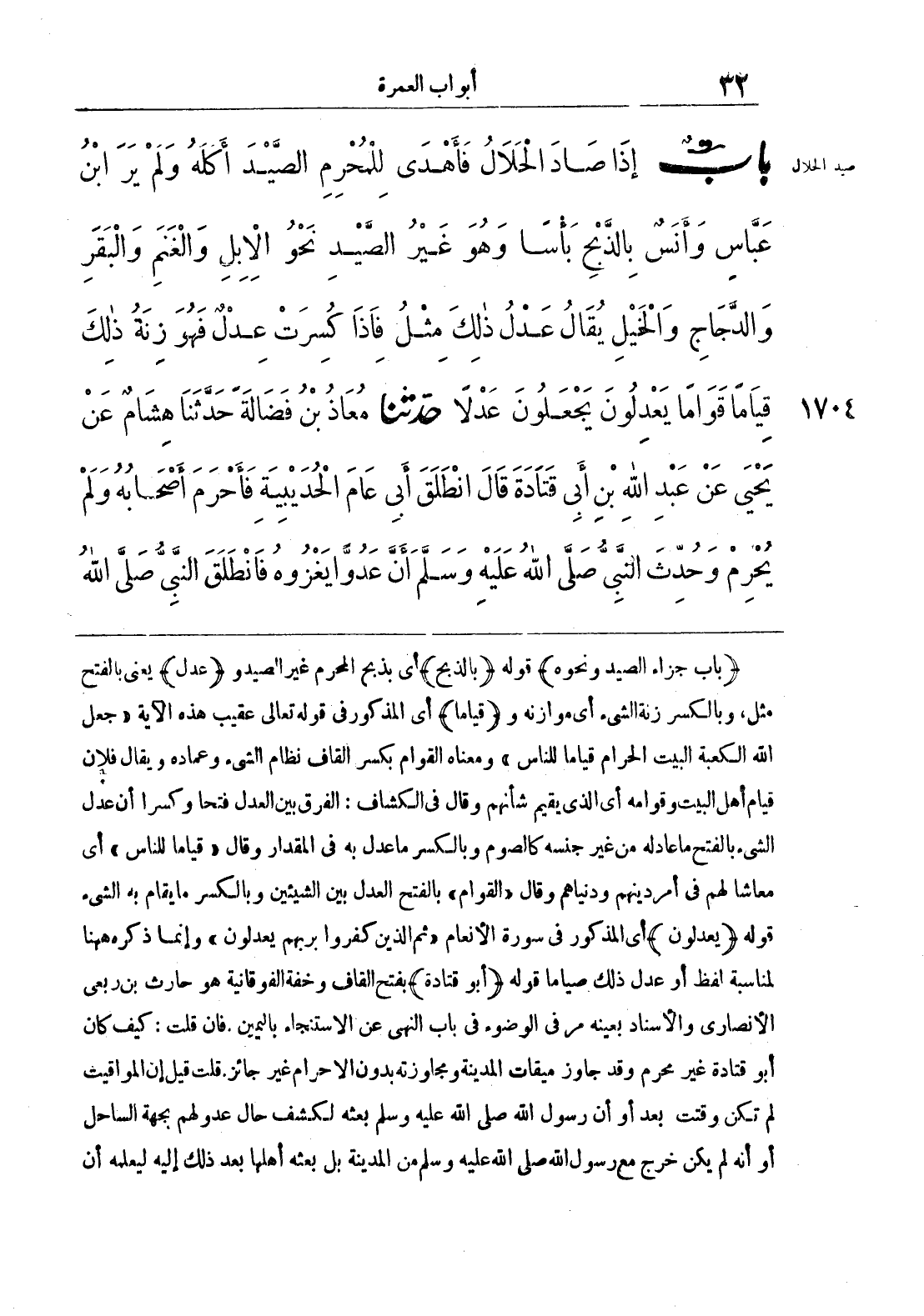 {باب جزاء الصيد ونحوه} قوله {بالذبح} أي بذبح المحرم غير الصيد و {العدل} يعني بالفتح مثل, وبالكسر زنة الشيء أي موازنة و {قياما} أي المذكور في قوله تعالى عقيب هذه الآية {جعل الله الكعبة البيت الحرام قياما للناس} ومعناه القوام بكسر القاف نظام الشيء وعماده ويقال فلان قيام أهل البيت وقوامه أي الذي يقيم شأنهم وقال في الكشاف: الفرق بين العدل فتحا وكسرا أن عدل الشيء بالفتح ما عاد له من غير جنسه كالصوم وبالكسر ما عدل به في المقدار وقال {قياما للناس} أي معاشا لهم في أمر دينهم ودنياهم وقال {القوام} بالفتح العدل بين الشيئين وبالكسر ما يقام به الشيء قوله {يعدلون} أي المذكور في سورة الأنعام {ثم الذين كفروا بربهم يعدلون} وإنما ذكره هنا لمناسبة لفظ أو عدل ذلك صياما قوله {أبو قتادة} بفتح القاف وخفة الفوقانية هو حارث بن ربعي الأنصاري والأسناد بعينه مر في الوضوء في باب النهي عن الاستنجاء باليمين, فإن قلت: كيف كان أبو قتادة غير محرم وقد جاوز ميقات المدينة ومجاوزته بدون الإحرام غير جائز ,قلت: كيف كان أبو قتادة غير محرم وقد جاوز ميقات المدينة ومجاوزته بدون الإحرام غير جائز , قلت قيل إن المواقيت لم تكن وقتت بعد أو أن رسول الله صلى الله عليه وسلم بعثه لكشف حال عدو لهم بجهة الساحل أو أنه لم يكن مع رسول الله صلى الله عليه وسلم من المدينة بل بعثه أهلها بعد ذلك إليه ليعلمه أن