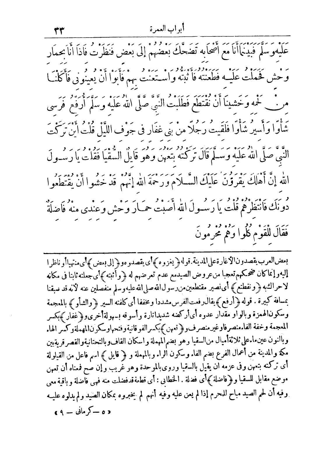 بعض العرب يقصدون الأغارة على المدينة, قوله {يغزوه} أي يقصدوه و {إلى بعض} أي منتهيا أو ناظرا إليه وإنما كان ضحكهم تعجبا من عروض الصيد مع عدم تعرضهم له {وأثبته} أي جعله ثابتا في مكانه لا حراك به {ونقطتع} أي نصير مقتطعين من رسول الله صلى الله عليه وسلم منفصلين عنه لأنه قد سبقنا بمسافة كبيرة, قوله {أرفع} يقال رفعت الفرس مشددا ومخففا أي كلفته السير {والشأو} بالمعجمة وسكون الهمزة وبالواو مقدار عدوه أي أركضه شديدا تارة وأسوقه بسهولة أخرى و {غفار} بكسر المعجمة وخفة الفاء منصرفا وغير منصرف و {تعهن} بكسر الفوقانية وفتحها وسكون المهملة وكسر الهاء وبالنون عين ماء على ثلاثة أميال من السقيا وهو بضم المهملة وإسكان القاف التحتانية والقصر قرية بين مكة والمدينة من أعمال الفرع بضم الفاء وسكون الراء وبالمهملة و {قايل} اسم فاعل من القيلولة أي تركته بتعهن وفي عزمه أن يقيل بالسقيا وروى بالموحدة وهو غريب وإن صح معناه أن تعهن موضع مقابل للسقيا و {فاضلة} أي فضلة, الخطابي: أي قطعة قد فضلت منه فهي فاضلة وباقية معي وفيه أن لحم الصيد مباح للمحرم إذا لم يعن عليه وفيه أنهم لم يخبروه بمكان الصيد ولم يدلوه عليه