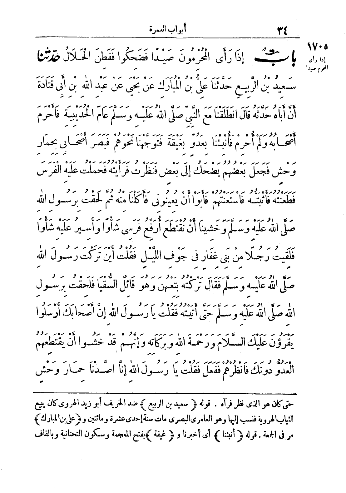 انْطَلَقْنَا مَعَ النَّبِيِّ صَلَّى اللَّهُ عَلَيْهِ وَسَلَّمَ عَامَ الْحُدَيْبِيَةِ فَأَحْرَمَ أَصْحَابُهُ وَلَمْ أُحْرِمْ فَأُنْبِئْنَا بِعَدُوٍّ بِغَيْقَةَ فَتَوَجَّهْنَا نَحْوَهُمْ فَبَصُرَ أَصْحَابِي بِحِمَارِ وَحْشٍ فَجَعَلَ بَعْضُهُمْ يَضْحَكُ إِلَى بَعْضٍ فَنَظَرْتُ فَرَأَيْتُهُ فَحَمَلْتُ عَلَيْهِ الْفَرَسَ فَطَعَنْتُهُ فَأَثْبَتُّهُ فَاسْتَعَنْتُهُمْ فَأَبَوْا أَنْ يُعِينُونِي فَأَكَلْنَا مِنْهُ ثُمَّ لَحِقْتُ بِرَسُولِ اللَّهِ صَلَّى اللَّهُ عَلَيْهِ وَسَلَّمَ وَخَشِينَا أَنْ نُقْتَطَعَ أَرْفَعُ فَرَسِي شَاوًا وَأَسِيرُ عَلَيْهِ شَاوًا فَلَقِيتُ رَجُلًا مِنْ بَنِي غِفَارٍ فِي جَوْفِ اللَّيْلِ فَقُلْتُ أَيْنَ تَرَكْتَ رَسُولَ اللَّهِ صَلَّى اللَّهُ عَلَيْهِ وَسَلَّمَ فَقَالَ تَرَكْتُهُ بِتَعْهَنَ وَهُوَ قَائِلٌ السُّقْيَا فَلَحِقْتُ بِرَسُولِ اللَّهِ صَلَّى اللَّهُ عَلَيْهِ وَسَلَّمَ حَتَّى أَتَيْتُهُ فَقُلْتُ يَا رَسُولَ اللَّهِ إِنَّ أَصْحَابَكَ أَرْسَلُوا يَقْرَءُونَ عَلَيْكَ السَّلَامَ وَرَحْمَةَ اللَّهِ وَبَرَكَاتِهِ وَإِنَّهُمْ قَدْ خَشُوا أَنْ يَقْتَطِعَهُمْ الْعَدُوُّ دُونَكَ فَانْظُرْهُمْ فَفَعَلَ فَقُلْتُ يَا رَسُولَ اللَّهِ إِنَّا اصَّدْنَا حِمَارَ وَحْشٍ