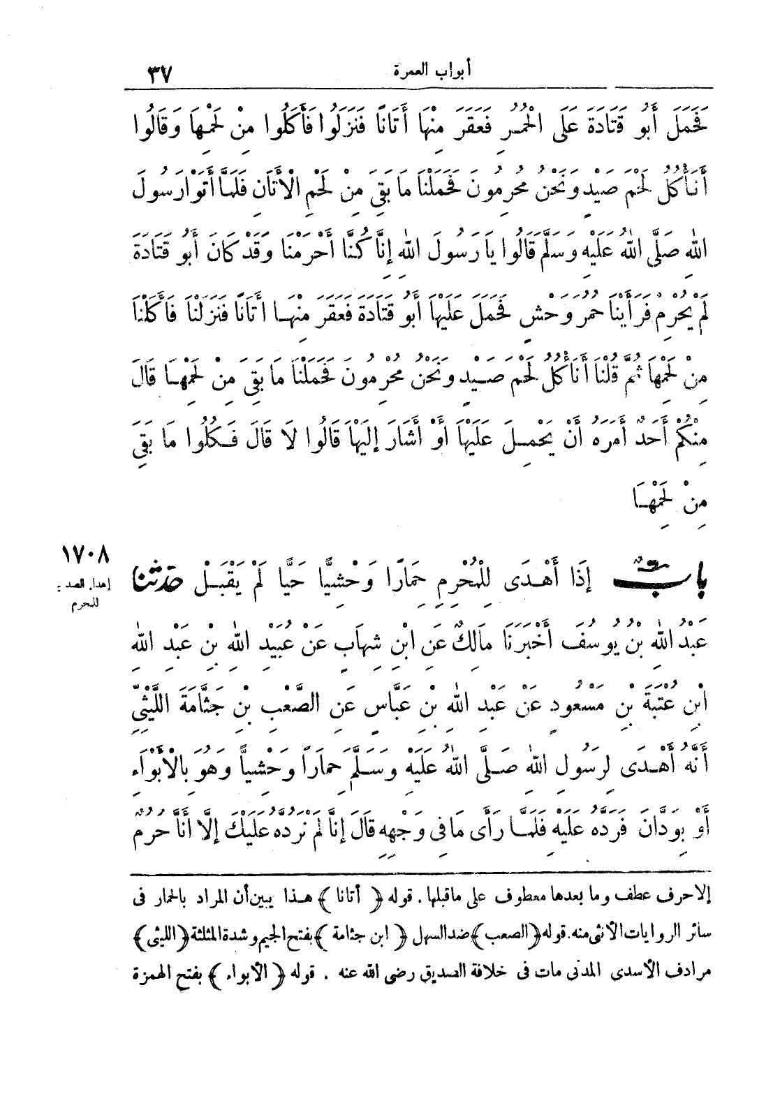 1708 - حَدَّثَنَا عَبْدُ اللَّهِ بْنُ يُوسُفَ أَخْبَرَنَا مَالِكٌ عَنْ ابْنِ شِهَابٍ عَنْ عُبَيْدِ اللَّهِ بْنِ عَبْدِ اللَّهِ بْنِ عُتْبَةَ بْنِ مَسْعُودٍ عَنْ عَبْدِ اللَّهِ بْنِ عَبَّاسٍ عَنْ الصَّعْبِ بْنِ جَثَّامَةَ اللَّيْثِيِّ أَنَّهُ أَهْدَى لِرَسُولِ اللَّهِ صَلَّى اللَّهُ عَلَيْهِ وَسَلَّمَ حِمَارًا وَحْشِيًّا وَهُوَ بِالْأَبْوَاءِ أَوْ بِوَدَّانَ فَرَدَّهُ عَلَيْهِ فَلَمَّا رَأَى مَا فِي وَجْهِهِ قَالَ إِنَّا لَمْ نَرُدَّهُ عَلَيْكَ إِلَّا أَنَّا حُرُمٌ