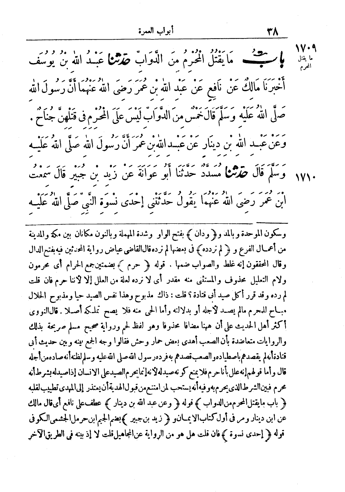 وسكون الموحدة وبالمد و {ودان} بفتح الواو وشدة المهملة وبالنون مكانان بين مكة والمدينة من أعمال الفرع و {لم نردده} في بعضها لم نرده قال القاضي عياض رواية المحدثين فيه بفتح الدال وقال المحققون إنه غلط والصواب ضمها ,وقوله {حرم} بضمتين جمع حرام أي محرمون ولام التعليل محذوف والمستثنى منه مقدر أي لا نرده لعلة من العلل إلا لأننا حرم فإن قلت لم رده وقد قرر أكل الصيد أبي قتادة؟ قلت: ذاك مذبوح وهذا نفس الصيد حيا ومذبوح الحلال مباح للمحرم مالم يصد لأجله أو بدلالته وأما الحي منه فلا يصح تملكه أصلا, قال النووي أكثر أهل الحديث على أن هنا مضافا محذوفا وهو لفظ لحم ورواية صحيح مسلم صريحة بذلك والروايات متعاضدة بأن الصعب أهدى بعض حمار وحش فقالوا وجه الجمع بينه وبين حديث أبي قتادة أنه لم يقصدهم باصطياده والصعب قصدهم به فرده رسول الله صلى الله عليه وسلم لظنه أنه صاده من أجله قال وأما قولهم إنه علل بأنا حرم فلا يمنع كونه صيد له لأنه إنما يحرم الصيد على الإنسان إذا صيد له بشرط أنه محرم فبين الشرط الذي يحرم به وفيه أنه يستحب لمن امتنع من قبول الهدية أن يعتذر إلى المهدي تطييب لقلبه {باب ما يقتل المحرم من الدواب} قوله {وعن عبد الله بن دينار} عطف على نافع أي قال مالك عن ابن دينار ومر في أول كتاب الإيمان و {زيد بن جبير} بضم الجيم ابن حرمل الجشمي الكوفي قوله {إحدى نسوة} فإن قلت هل هو من الرواية عن المجاهيل قلت لا إذ بينه في الطريق الآخر