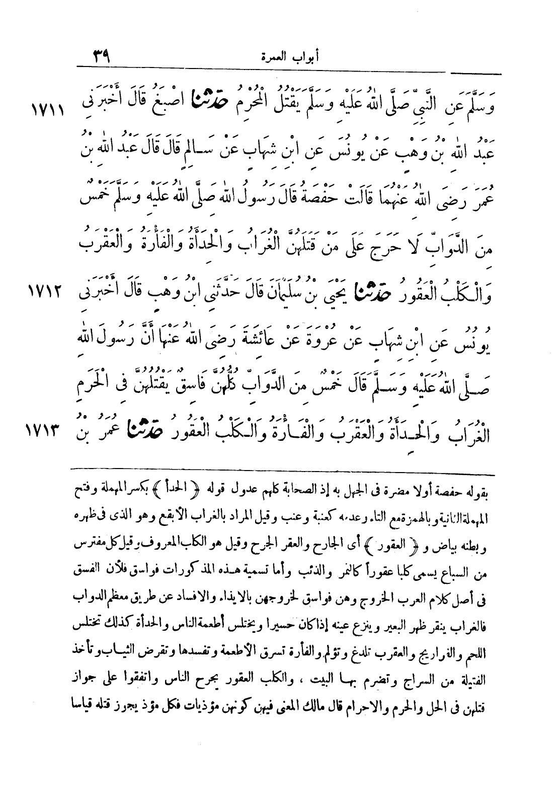 1711 - حَدَّثَنَا أَصْبَغُ بْنُ الْفَرَجِ قَالَ أَخْبَرَنِي عَبْدُ اللَّهِ بْنُ وَهْبٍ عَنْ يُونُسَ عَنْ ابْنِ شِهَابٍ عَنْ سَالِمٍ قَالَ قَالَ عَبْدُ اللَّهِ بْنُ عُمَرَ رَضِيَ اللَّهُ عَنْهُمَا قَالَتْ حَفْصَةُ قَالَ رَسُولُ اللَّهِ صَلَّى اللَّهُ عَلَيْهِ وَسَلَّمَ خَمْسٌ مِنْ الدَّوَابِّ لَا حَرَجَ عَلَى مَنْ قَتَلَهُنَّ الْغُرَابُ وَالْحِدَأَةُ وَالْفَارَةُ وَالْعَقْرَبُ وَالْكَلْبُ الْعَقُورُ