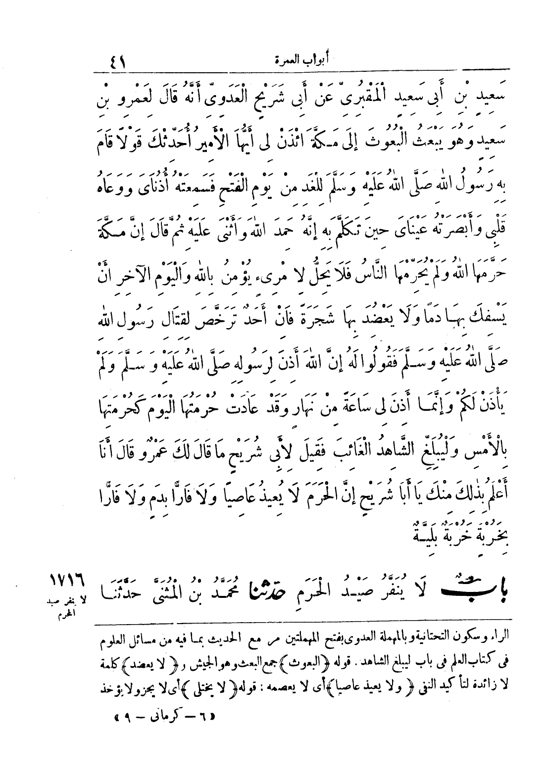 أَنَّهُ قَالَ لِعَمْرِو بْنِ سَعِيدٍ وَهُوَ يَبْعَثُ الْبُعُوثَ إِلَى مَكَّةَ ائْذَنْ لِي أَيُّهَا الْأَمِيرُ أُحَدِّثْكَ قَوْلًا قَامَ بِهِ رَسُولُ اللَّهِ صَلَّى اللَّهُ عَلَيْهِ وَسَلَّمَ لِلْغَدِ مِنْ يَوْمِ الْفَتْحِ فَسَمِعَتْهُ أُذُنَايَ وَوَعَاهُ قَلْبِي وَأَبْصَرَتْهُ عَيْنَايَ حِينَ تَكَلَّمَ بِهِ إِنَّهُ حَمِدَ اللَّهَ وَأَثْنَى عَلَيْهِ ثُمَّ قَالَ إِنَّ مَكَّةَ حَرَّمَهَا اللَّهُ وَلَمْ يُحَرِّمْهَا النَّاسُ فَلَا يَحِلُّ لِامْرِئٍ يُؤْمِنُ بِاللَّهِ وَالْيَوْمِ الْآخِرِ أَنْ يَسْفِكَ بِهَا دَمًا وَلَا يَعْضُدَ بِهَا شَجَرَةً فَإِنْ أَحَدٌ تَرَخَّصَ لِقِتَالِ رَسُولِ اللَّهِ صَلَّى اللَّهُ عَلَيْهِ وَسَلَّمَ فَقُولُوا لَهُ إِنَّ اللَّهَ أَذِنَ لِرَسُولِهِ صَلَّى اللَّهُ عَلَيْهِ وَسَلَّمَ وَلَمْ يَاذَنْ لَكُمْ وَإِنَّمَا أَذِنَ لِي سَاعَةً مِنْ نَهَارٍ وَقَدْ عَادَتْ حُرْمَتُهَا الْيَوْمَ كَحُرْمَتِهَا بِالْأَمْسِ وَلْيُبَلِّغْ الشَّاهِدُ الْغَائِبَ فَقِيلَ لِأَبِي شُرَيْحٍ مَا قَالَ لَكَ عَمْرٌو قَالَ أَنَا أَعْلَمُ بِذَلِكَ مِنْكَ يَا أَبَا شُرَيْحٍ إِنَّ الْحَرَمَ لَا يُعِيذُ عَاصِيًا وَلَا فَارًّا بِدَمٍ وَلَا فَارًّا بِخُرْبَةٍ
