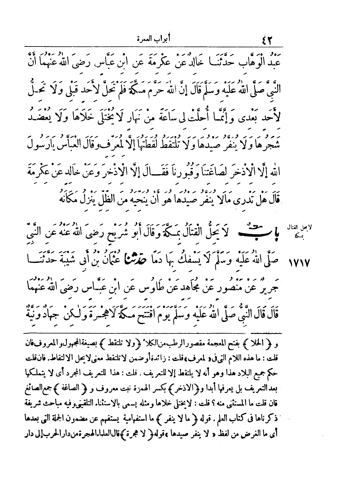 و {الخلا} بفتح المعجمة مقصور الرطب من الكلأ {ولا تلتقط} بصيغة المجهول والمعروف فإن قلت: ما هذه اللام التي في «لمعرف» قلت: زائدة أو ضمن لا تلتقط معنى لا يحل الالتقاط , فإن قلت حكم جميع البلاد هذا وهو أنه لا يلتقط إلا للتعريف , قلت: هذا للتعريف المجرد أي لا يتملكها بعد التعريف بل يعرفها أبدا و {الاذخر} بكسر الهمزة نبت معروف و {الصاغة} جمع الصائغ فإن قلت ما استثنى منه؟ قلت: لا يختلي خلاها ومثله يسمى بالاستثناء التلقيني وفيه مباحث شريفة ذكرناها في كتاب العلم , قوله {ما لا ينفر} ما استفهامية يستفهم عن مضمون الجملة التي بعدها أي ما الغرض من لفظ {لا ينفر صيدها} قوله {لا هجرة} قال العلماء الهجرة من دار الحرب إلى دار