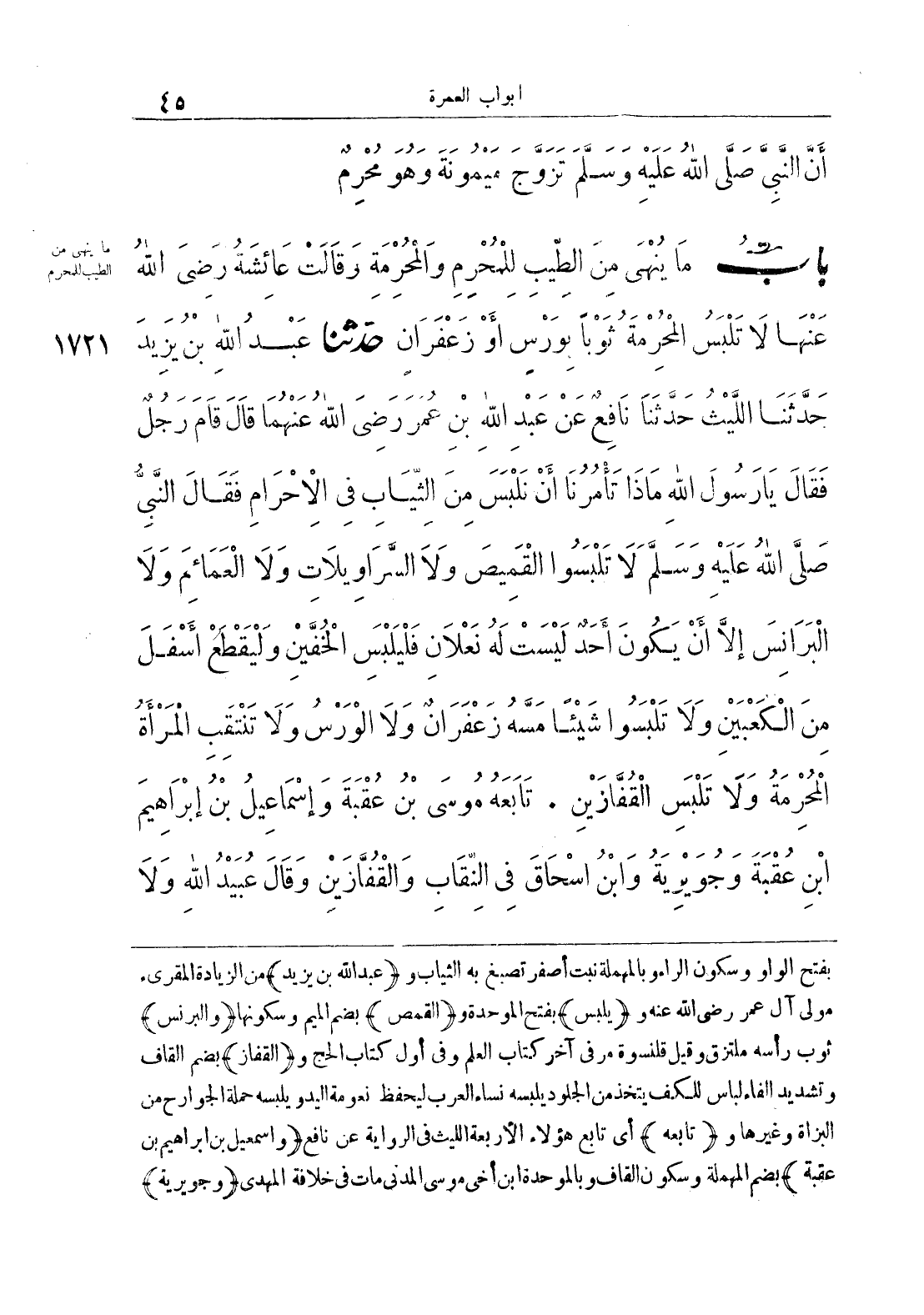 بفتح الواو وسكون الراء وبالمهملة نبت أصفر تصبغ به الثياب و {عبد الله بن يزيد} من الزيادة المقرئ مولى آل عمر رضي الله عنه و {يلبس} بفتح الموحدة و {القمص} بضم الميم وسكونها {والبرنس} ثوب رأسه ملتزق وقيل قلنسوة مر في آخر كتاب العلم وفي أول كتاب الحج و {القفاز} بضم القاف وتشديد الفاء لباس للكف يتخذ من الجلود يلبسه نساء العرب ليحفظ نعومة اليد ويلبسه حملة الجوارح من البزاة وغيرها و {تابعه} أي تابع هؤلاء الأربعة الليث في الرواية عن نافع {وإسمعيل بن إبراهيم بن عقبة} بضم المهملة وسكون القاف وبالموحدة ابن أخي موسى المدني مات في خلافة المهدي {وجويرية}