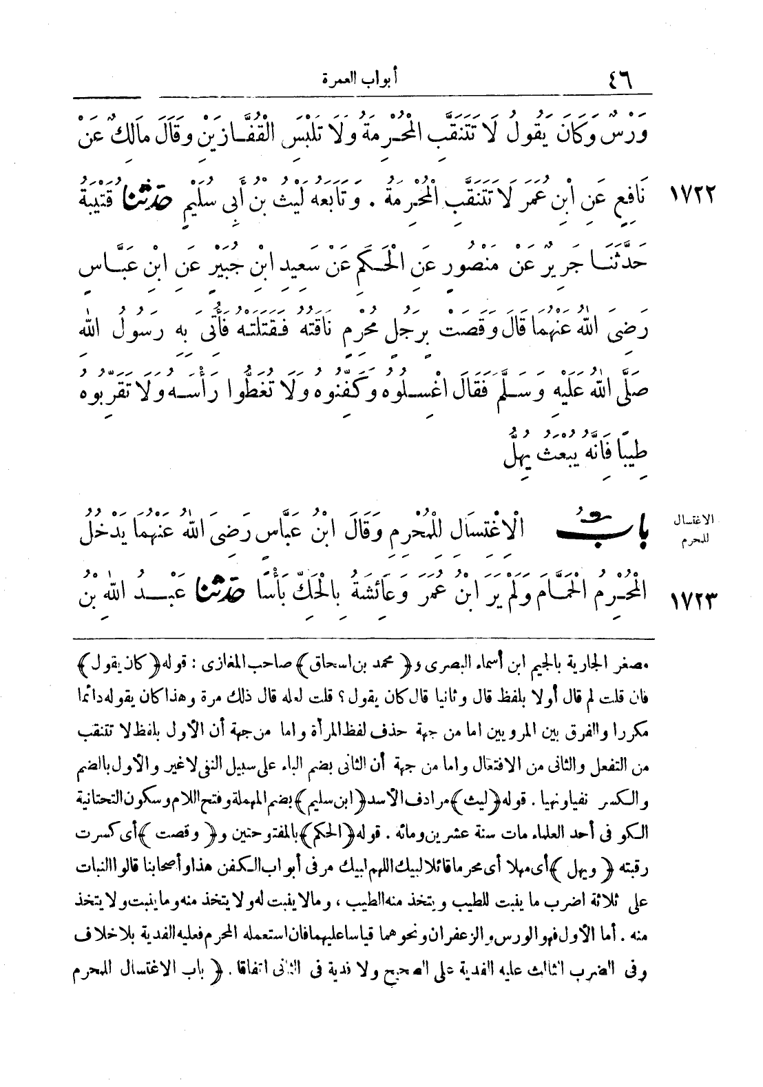 مصغر الجارية بالجيم ابن أسماء البصري و {محمد بن إسحاق} صاحب المغازي: قوله {كان يقول} فإن قلت لم قال أولا بلفظ قال وثانيا قال كان يقول؟ قلت لعله قال ذلك مرة وهذا كان يقوله دائما مكررا والفرق بين المرورين إما من جهة حذف لفظ المرأة وإما من جهة أن الأول بلفظ لا تتنقب من التفعل والثاني من الافتعال وإما من جهة أن الثاني بضم الباء على سبيل النفي لا غير والأول بالضم والكسر نفيا ونهيا , قوله {ليث} مرادف الأسد {ابن سليم} بضم المهملة وفتح اللام وسكون التحتانية الكوفي أحد العلماء مات سنة عشرين ومائة ,قوله {الحكم} بالمفتوحتين و {وقصت} أي كسرت رقبته {ويهل} أي مهلا أي محرما قائلا لبيك اللهم لبيك مر في أبواب الكفن هذا وأصحابنا قالوا النبات على ثلاثة اضرب ما ينبت للطيب ويتخذ منه الطيب , ومالا ينبت له ولا يتخذ منه وما ينبت ولا يتخذ منه , أما الأول فهو الورس والزعفران ونحوهما قياسا عليهما فإن استعمله المحرم فعليه الفدية بلا خلاف وفي الضرب الثالث عليه الفدية على الصحيح ولا فديةفي الثاني اتفاقا , {باب الاغتسال للمحرم
