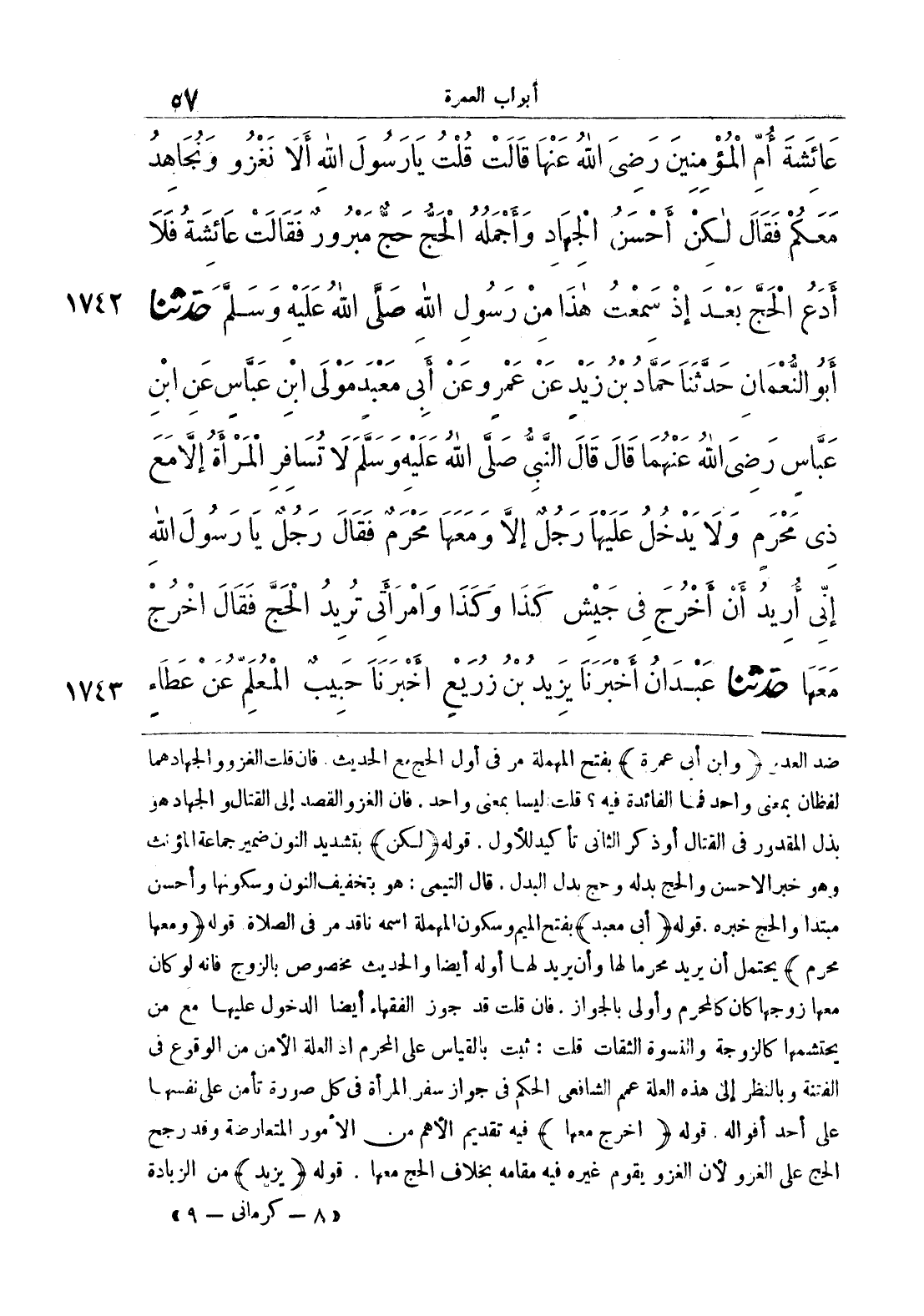 ضد العدو {وابن أبي عمرة} بفتح المهملة مر في أول الحج مع الحديث, فإن قلت الغزو والجهاد هما لفظان بمعنى واحد فما فائدة فيه؟ قلت: ليسا بمعنى واحد, فإن الغزو القصد إلى القتال والجهاد هو بذل المقدور في القتال أو ذكر الثاني تأكيد للأول , قوله {لكن} بتشديد النون ضمير جماعة المؤنث وهو خبر الأحسن والحج بدله وحج بدل البدل, قال التيمي: هو بتخفيف النون وسكونها وأحسن مبتدأ والحج خبره, قوله {أبي معبد} بفتح الميم وسكون المهملة اسمه ناقد مر في صلاة ,قوله {ومعها محرم} يحتمل أن يريد محرما لها أوله أيضا والحديث مخصوص بالزوج فإنه لو كان معها زوجها كان كالمحرم وأولى بالجواز, فإن قلت قد جوز الفقهاء أيضا الدخول عليها مع من يحتشمها كالزوجة والنسوة الثقات قلت: ثبت بالقياس على المحرم إذ العلة الأمن من الوقوع في الفتنة وبالنظر إلى العلة عمم الشافعي الحكم في جواز سفر المرأة في كل صورة تأمن على نفسها على أحد أقواله , قوله {اخرج معها} فيه تقديم الأهم من الأمور المتعارضة وقد رجح الحج على الغزو لأن الغزو يقوم غيره فيه مقامه بخلاف الحج معها, قوله {يزيد} من الزيادة