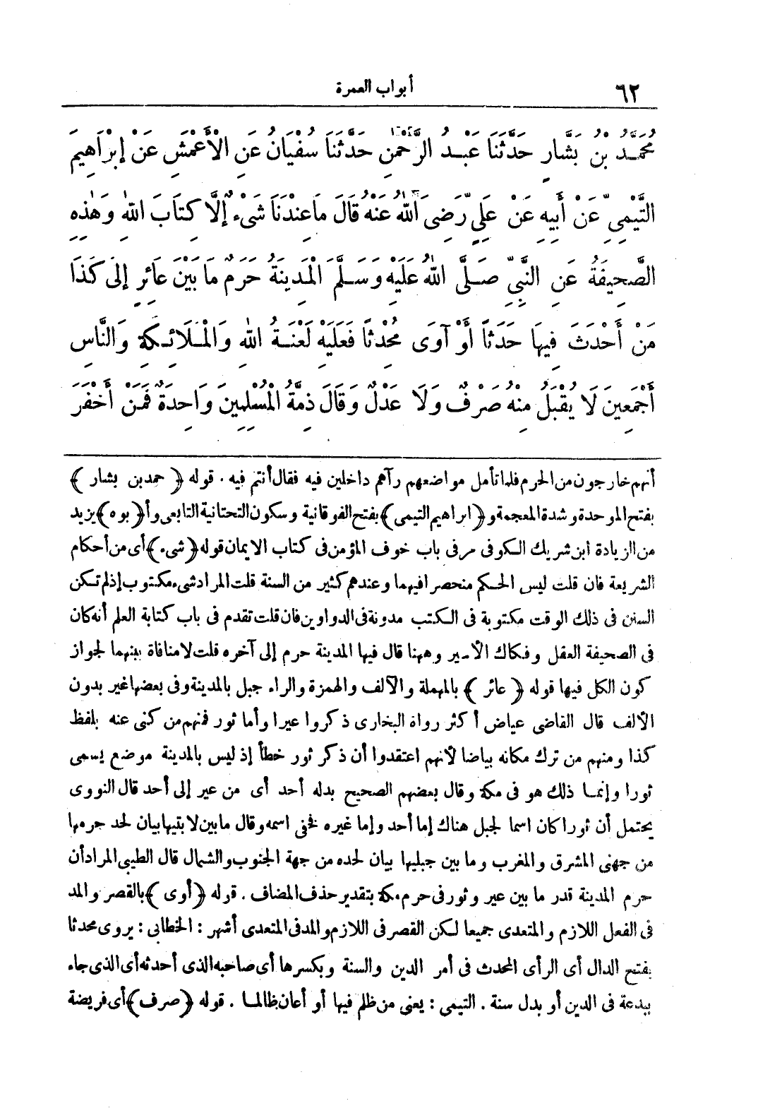 أنهم خارجون من الحرم فلما تأمل مواضعهم رآهم داخلين فيه فقال أنتم فيه, قوله {حمد بن بشار} بفتح الموحدة وشدة المعجمة و {إبراهيم التيمي} بفتح الفوقانية وسكون التحتانية التابعي و {أبوه} يزيد من الزيادة ابن شريك الكوفي مر في باب خوف المؤمن في كتاب الإيمان قوله {شيء} أي من أحكام الشريعة فإن قلت ليس الحكم منحصرا فيهما وعندهم كثير من السنة قلت المراد شيء مكتوب إذ لم تكن السنن في ذلك الوقت مكتوبة في الكتب مدونة في الدواوين فإن قلت تقدم في باب كتابة العلم أنه كان في الصحيفة العقل وفكاك الأسير وههنا قال فيها المدينة حرم إلى آخره قلت لا منافاة بينهما لجواز كون الكل فيها قوله {عائر} بالمهملة والآلف والهمزة والراء جبل بالمدينة وفي بعضها غير بدون الألف قال القاضي عياض أكثر رواة البخاري ذكروا عيرا وأما ثور فمنهم من كنى عنه بلفظ كذا ومنهم من ترك مكانه بياضا لأنهم اعتقدوا أن ذكر ثور خطأ إذ ليس بالمدينة موضع يسمى ثورا وإنما ذلك هو في مكة وقال بعضهم الصحيح بدله أحد أي من عير إلى أحد قال النووي يحتمل أن ثورا كان اسما لجبل هناك إما أحد وإما غيره فخفي اسمه وقال ما بين لابتيها بيان لحد حرمها من جهتي المشرق والمغرب وما جبليها بيان لحده من جهة الجنوب والشمال قال الطيبي المراد أن حرم المدينة قدر ما بين عير وثور في حرم مكة بتقدير حذف المضاف, قوله {أوى} بالقصر والمد في الفعل اللازم والمتعدي جميعا لكن القصر في اللازم والمد في المتعدي أشهر: الخطابي: يروي محدثا بفتح الدال أي الرأي المحدث في أمر الدين والسنة وبكسرها أي صاحبه الذي أحدثه أي الذي جاء ببدعة في الدين أو بدل سنة, التيمي: يعني من ظلم فيها أو أعان ظالما , قوله {صرف} أي فريضة