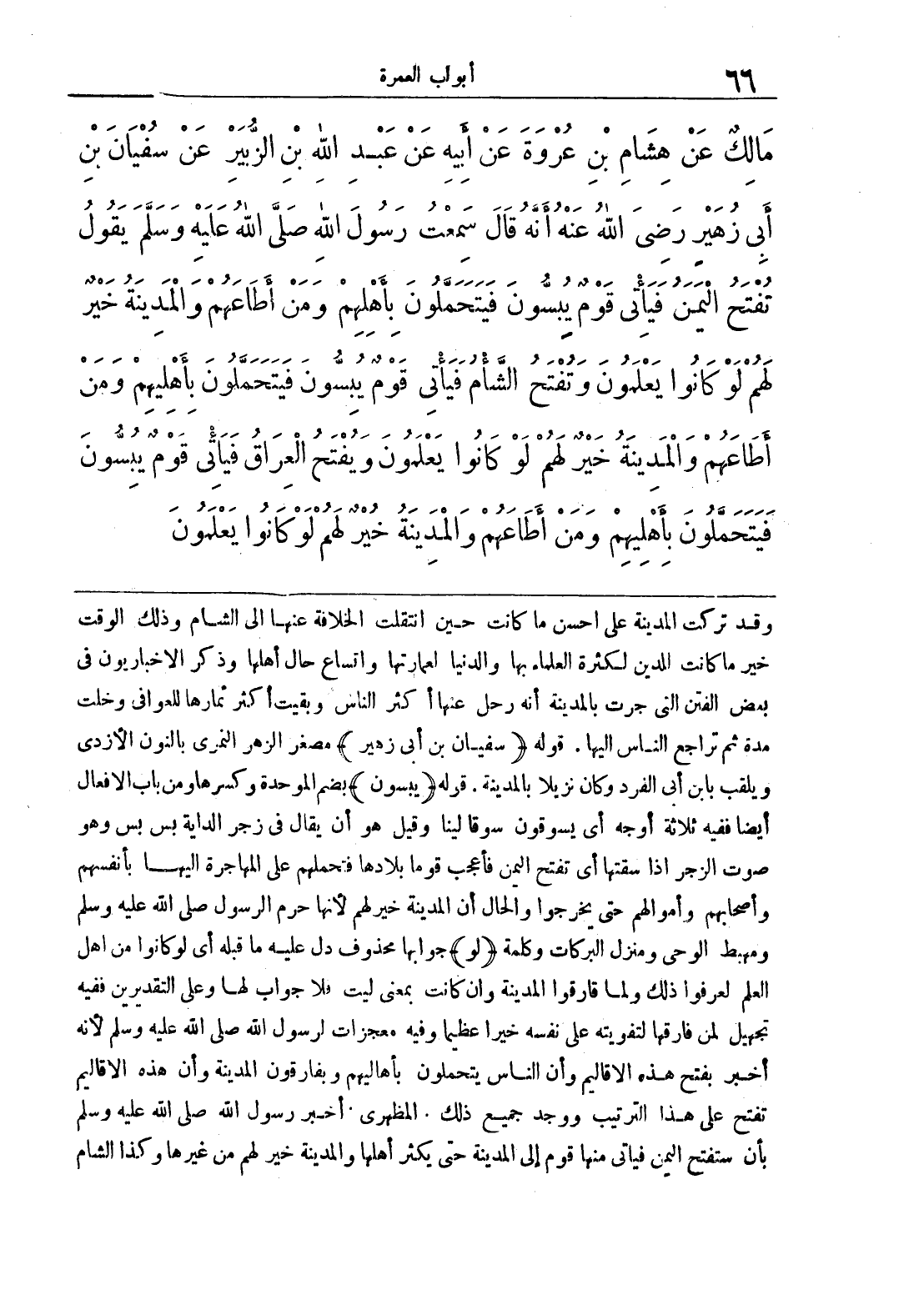 وقد تركت المدينة على أحسن ما كانت حين انتقلت الخلافة عنها إلى الشام وذلك الوقت خير ما كانت الدين لكثرة العلماء بها والدنيا لعمارتها واتساع حال أهلها وذكر الإخباريون في بعض الفتن التي جرت بالمدينة أنه رحل عنها أكثر الناس وبقيت أكثر ثمارها للعوافي وخلت مدة ثم تراجع الناس إليها, قوله {سفيان بن أبي زهير} مصغر الزهر النمري بالنون الأزدي ويلقب بابن أبي الفرد وكان نزيلا بالمدينة, قوله {يبسون} بضم الموحدة وكسرها ومن باب الأفعال أيضا فيفه ثلاثة أوجه أي يسوقون سوقا لينا وقيل هو أن يقال في زجر الداية بس بس وهو صوت الزجر إذا سقتها أي تفتح اليمن فأعجب قوما بلادها فتحملهم على المهاجرة إليها بأنفسهم وأصحابهم وأموالهم حتى يخرجوا والحال أن المدينة خيرهم لأنها حرم الرسول صلى الله عليه وسلم ومهبط الوحي ومنزل البركات وكلمة {لو} جوابها محذوف دل عليه ما قبله أي لو كانوا من أهل العلم لعرفوا ذلك ولما قارقوا المدينة وإن كانت بمعنى ليت فلا جواب لها وعلى التقديرين ففيه تجهيل لمن فارقها لتفويته على نفسه خيرا عظيما وفيه معجزات لرسول الله صلى الله عليه وسلم لأنه أخبر بفتح هذه الأقاليم وأن الناس يتحملون بأهاليهم ويفارقون المدينة وأن هذه الأقاليم تفتح على هذا الترتيب ووجد جميع ذلك, المظهري أخبره رسول الله صلى الله عليه وسلم بأن ستفتح اليمن فيأتي منها قوم إلى المدينة حتى يكثر أهلها والمدينة خير لهم من غيرها وكذا الشام